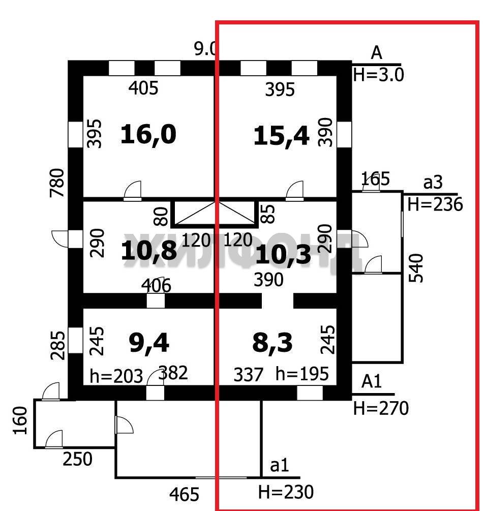 Изолированные комнаты (15.4 кв.м и 9.4 кв.м) на обе стороны, кухня гостиная 10.3 кв.м