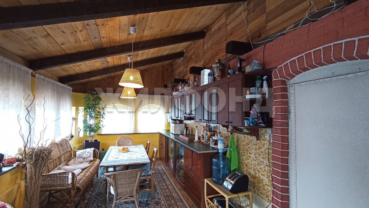 Первый этаж из кирпича: веранда-столовая, просторная гостиная с камином (отапливается дровами)., второй этаж - дерево : две спальни, два балкона.