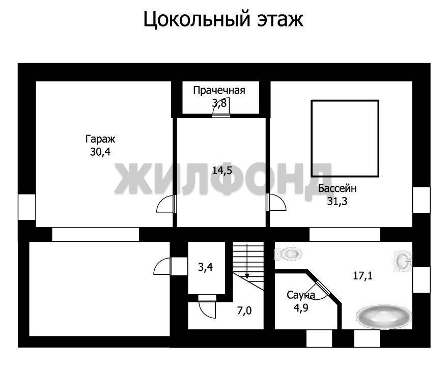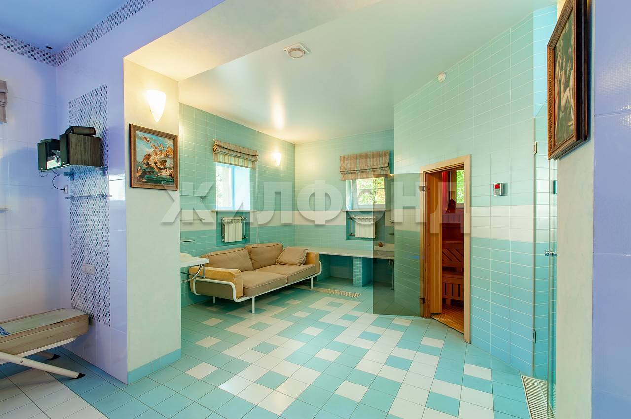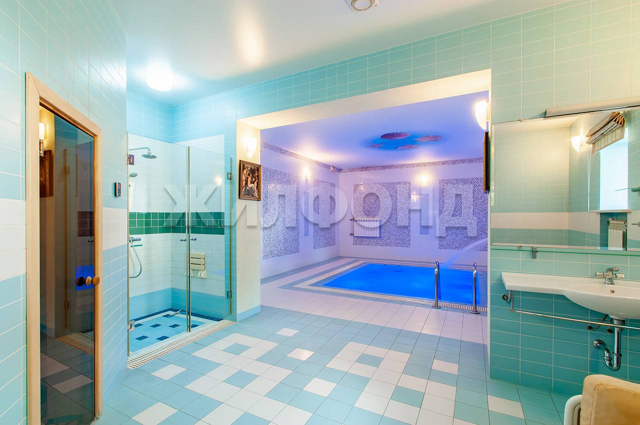 На цокольном этаже 112 м2 располагается бассейн с зоной отдыха и сауной, прачечная и с.у для горничной, гараж.