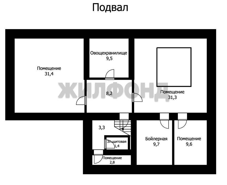 В подвале площадью 97 м2, расположено техническое помещение для обслуживания системы водоочистки бассейна, кладовые и винный погреб.