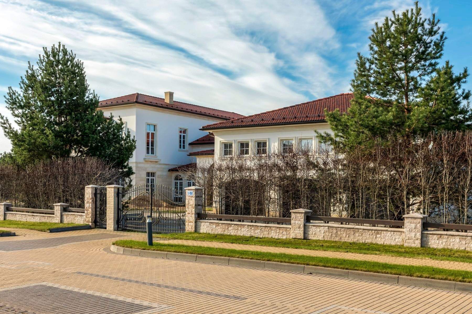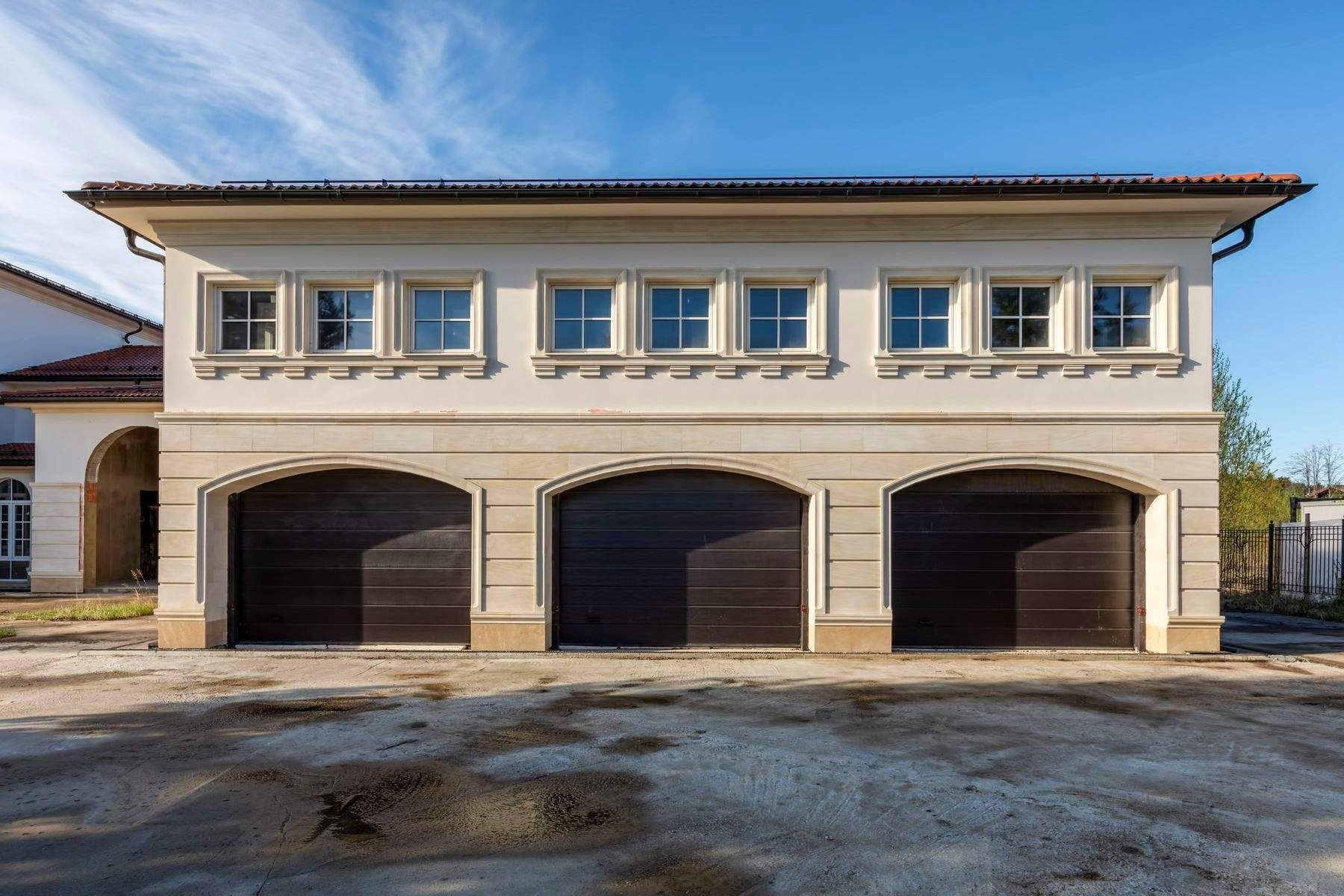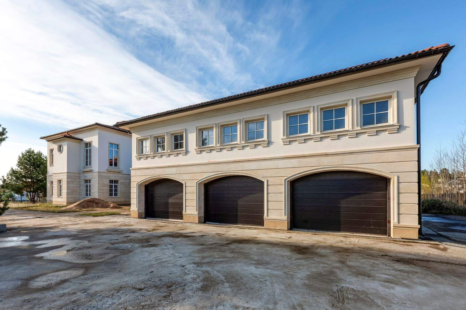 Особенности проекта - бассейн, сауна, тренажерный зал, цокольный этаж свободного назначения; отдельно стоящее здание 180 м - гараж на 3 авто, второй этаж для персонала.
