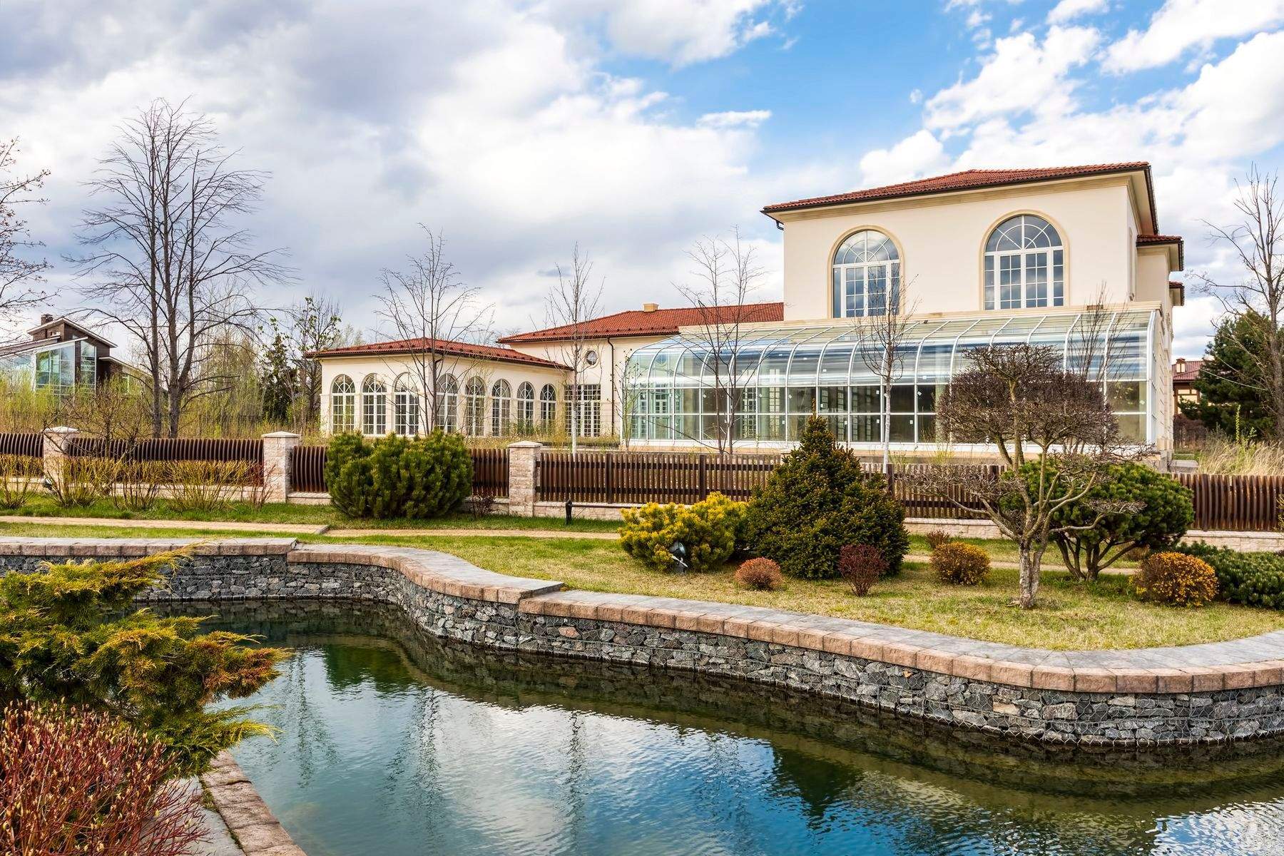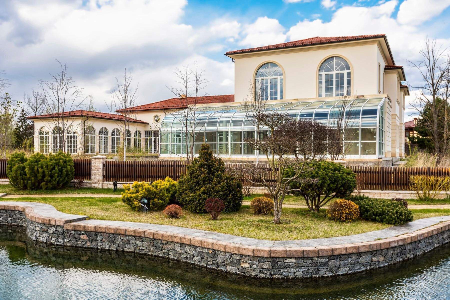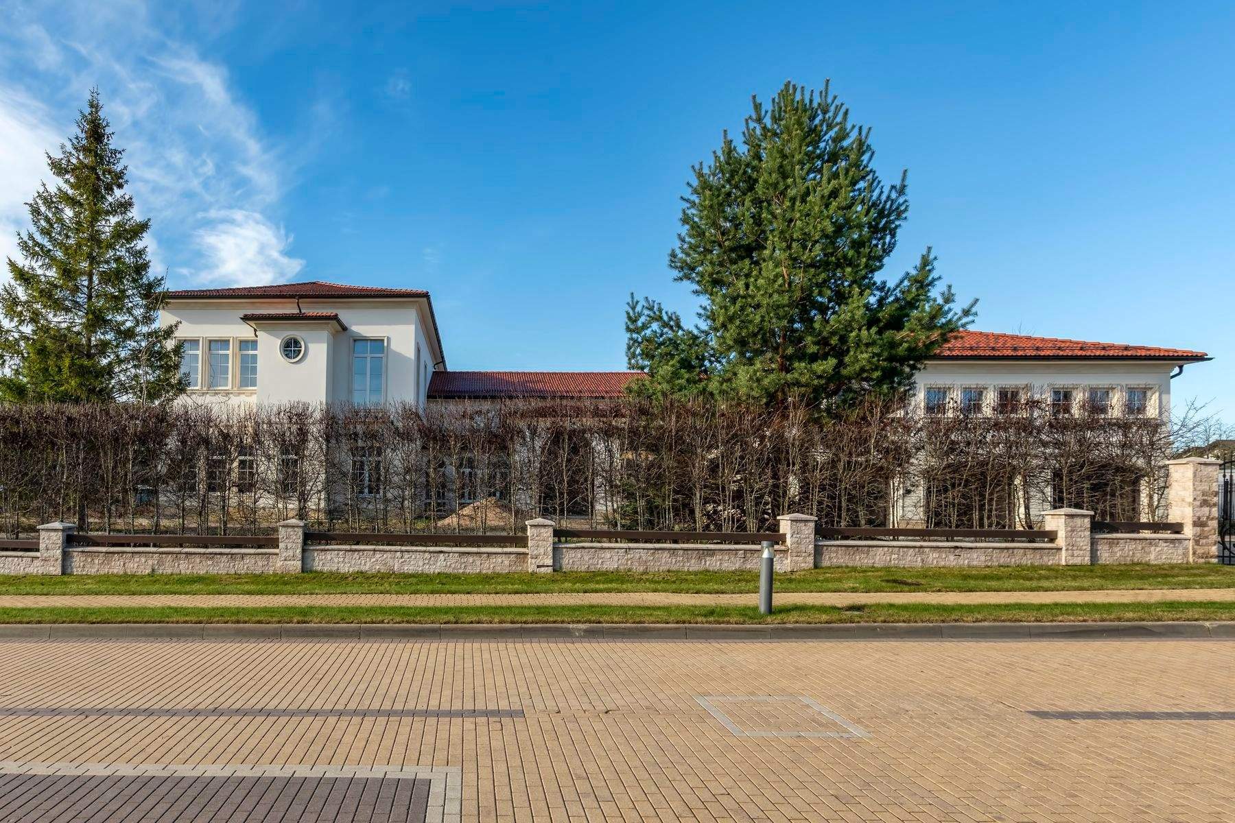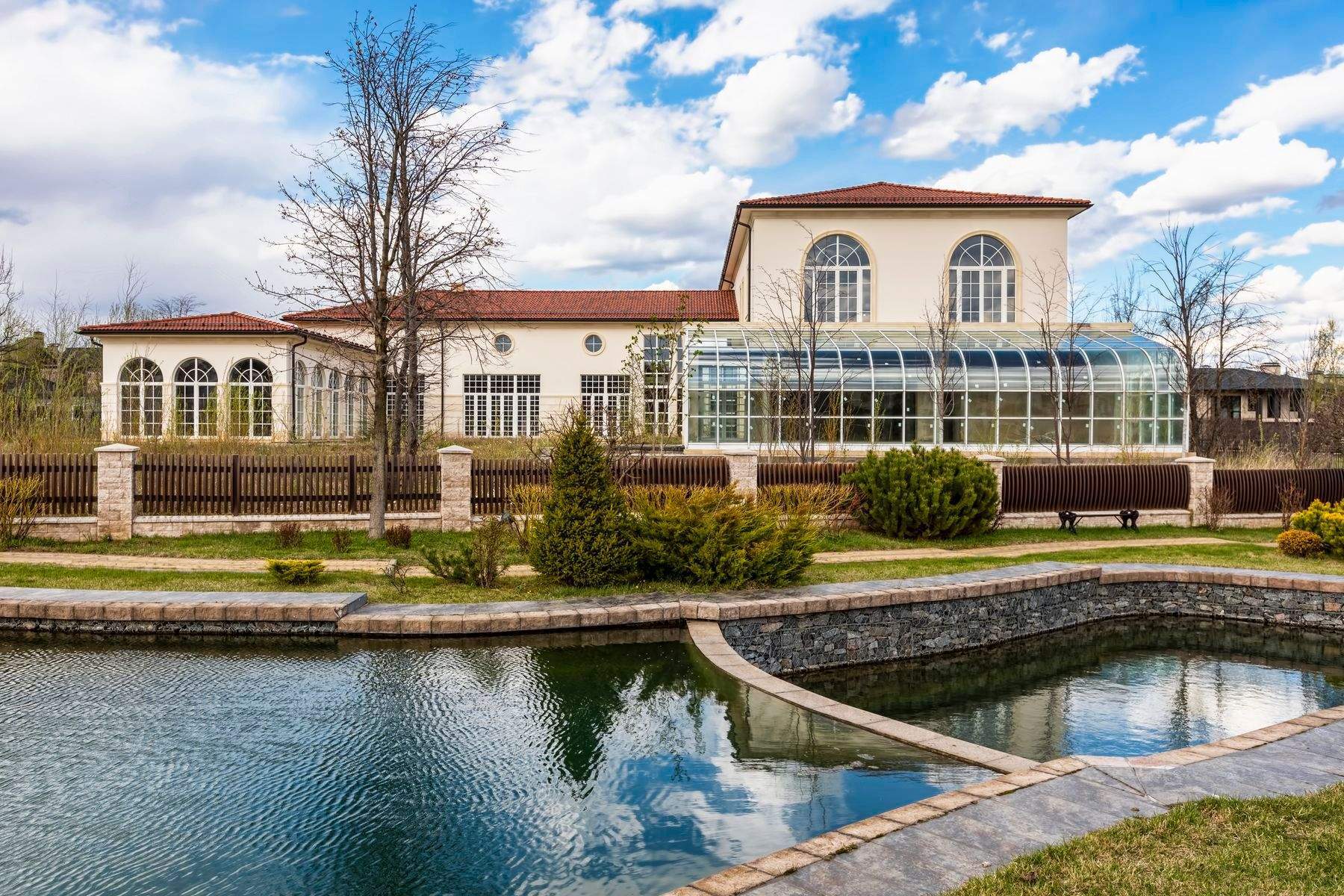 Особенности проекта - бассейн, сауна, тренажерный зал, цокольный этаж свободного назначения; отдельно стоящее здание 180 м - гараж на 3 авто, второй этаж для персонала.