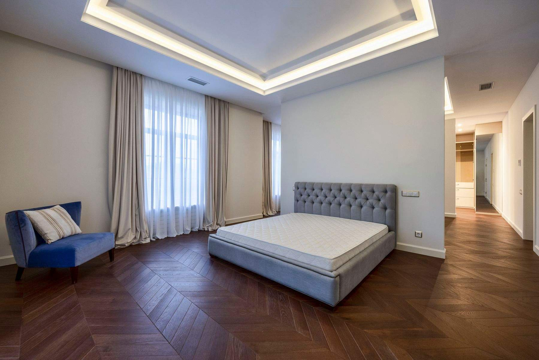 Мастер-спальня выходит на террасу. В основе дома лежит кирпично-монолитная конструкция- одна из самых прочных и долговечных.