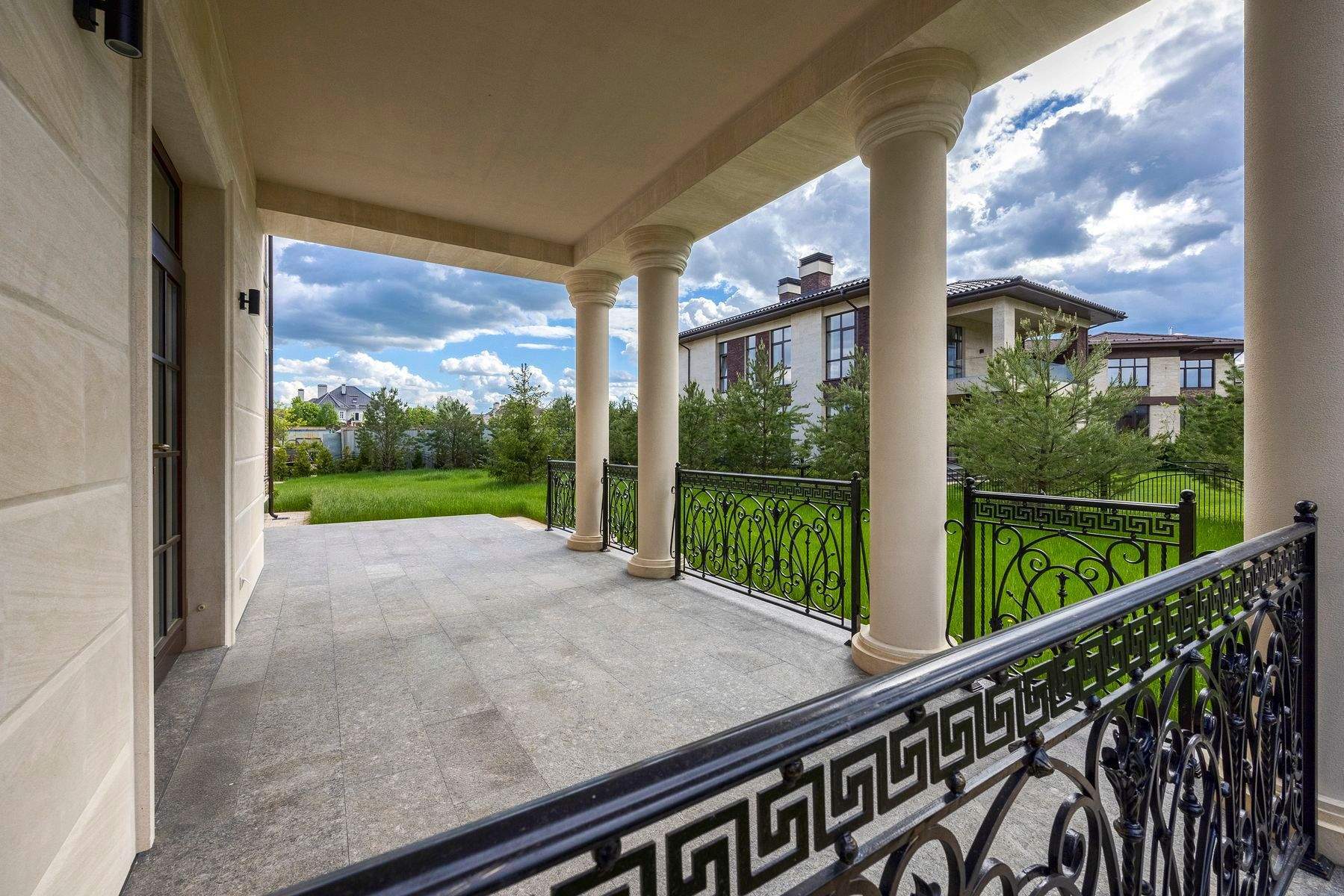 На участке выполнен ландшафтный дизайн, растут густые ели.