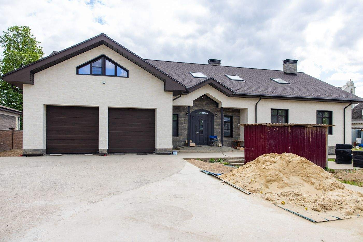 Загородный дом площадью 427 м построен на полевом участке 28 соток. Фасад здания облицован бежевыми панелями и декорирован серым клинкерным камнем.