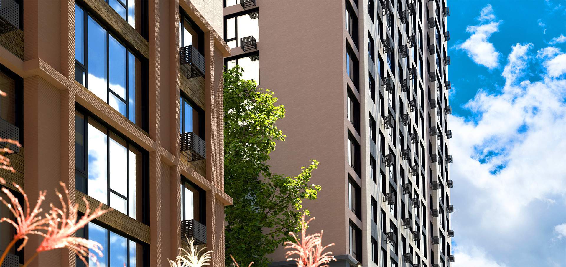 Архитекторы разработали концепцию, которая позволяет гармонично вписать проект в его природное окружение, используя оттенки белого, коричневого, терракотового цветов. Монолитные дома спроектированы с качественными фиброцементными фасадами. Просторные лоджии и панорамное остекление наполняют квартиры светом и воздухом и позволяют любоваться пейзажами.