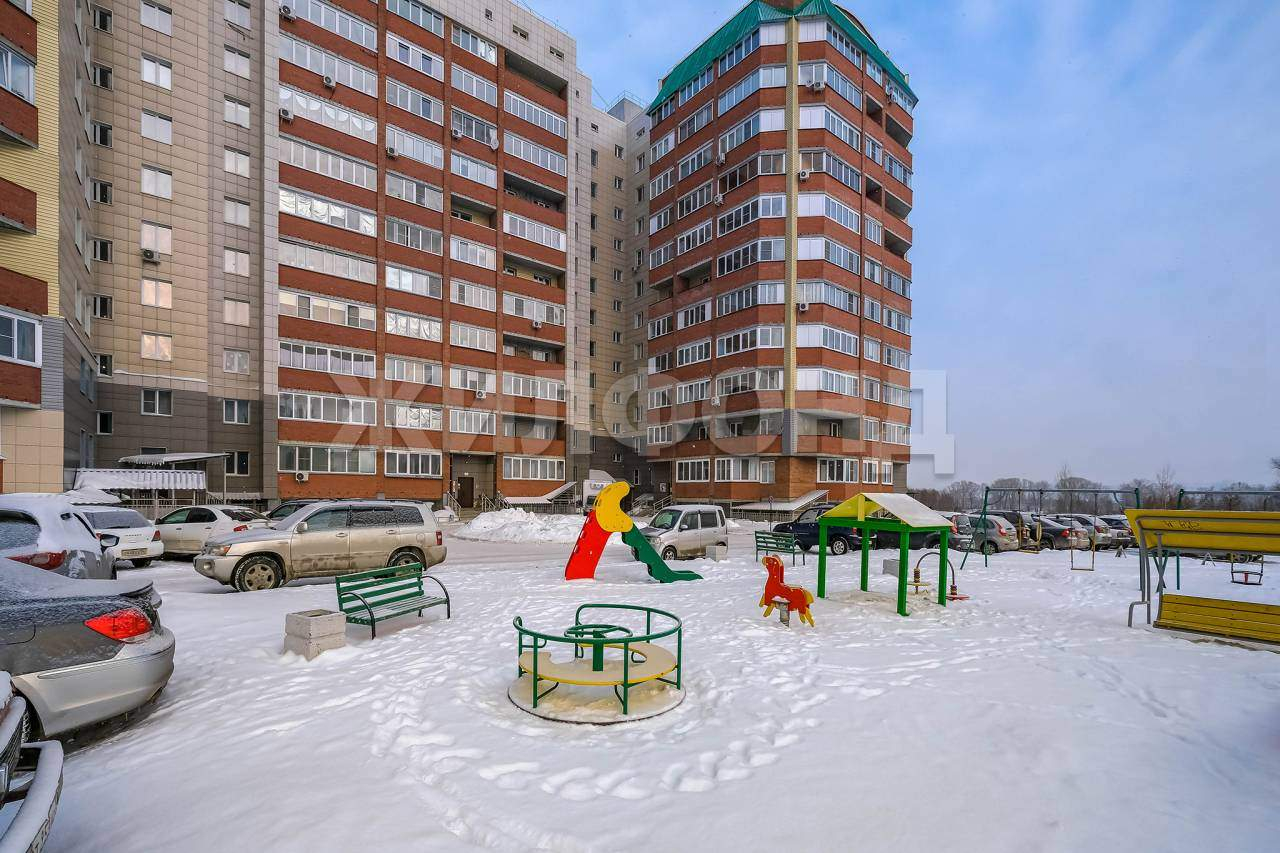 Из окна великолепный вид на р. Обь и новый мост, просторный обустроенный детскими площадками и местами для парковки двор, рядом школа и два детских садика, конечная остановка автобуса