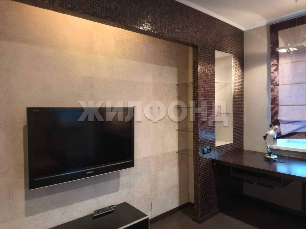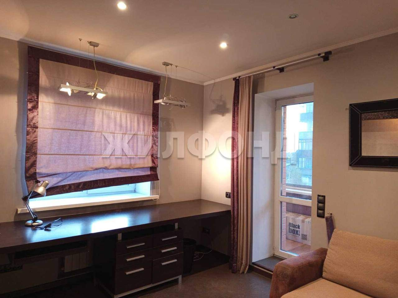 Одна из комнат оборудована как кабинет, с большим столом и комфортным освещением.