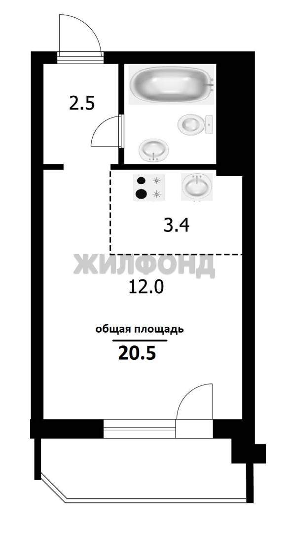 Общая площадь студии составляет 20.5 кв.м. , что позволяет создать хорошую и комфортную обстановку для жизни.