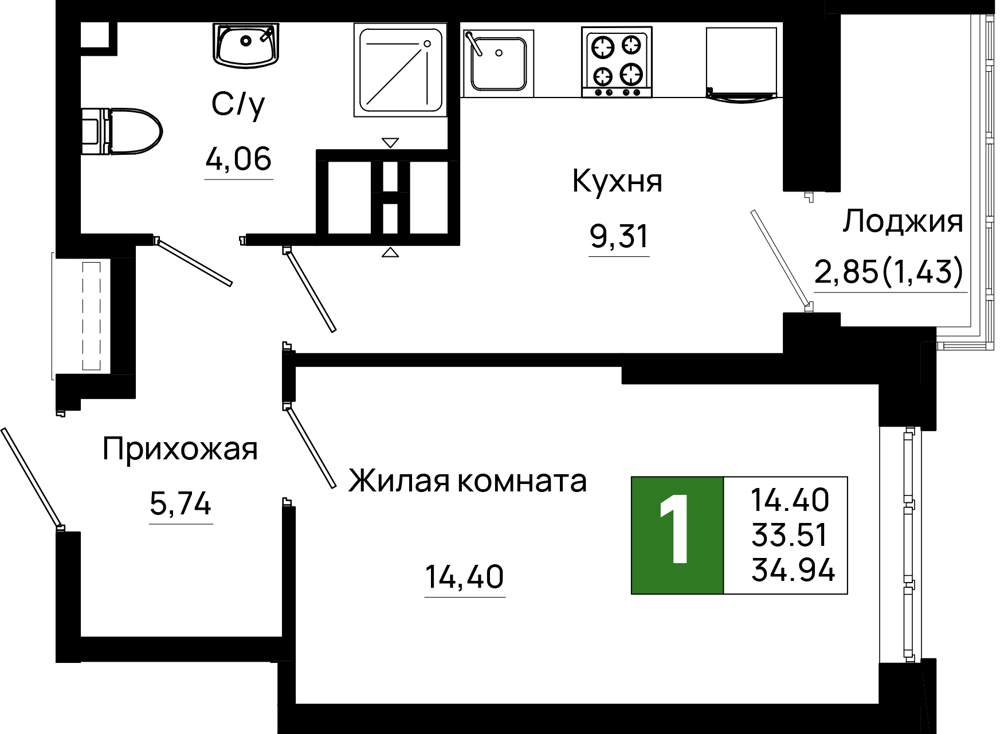 Жилая площадь 34.1 м2, кухня 10.19 м2, предчистовая отделка.