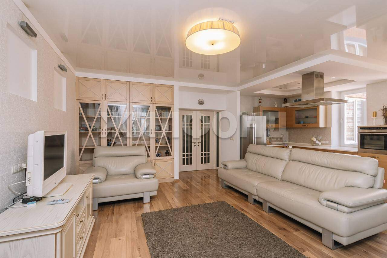 На первом этаже: 2 вместительные гардеробные, встроенный шкаф для верхней одежды, гостевой санузел, сауна отделана из массива (дерева) Большая (39,8 м2) кухня-гостинная выполнена в теплых тонах со встроенной бытовой техникой фирмы NЕFF, выход на застекленный балкон.