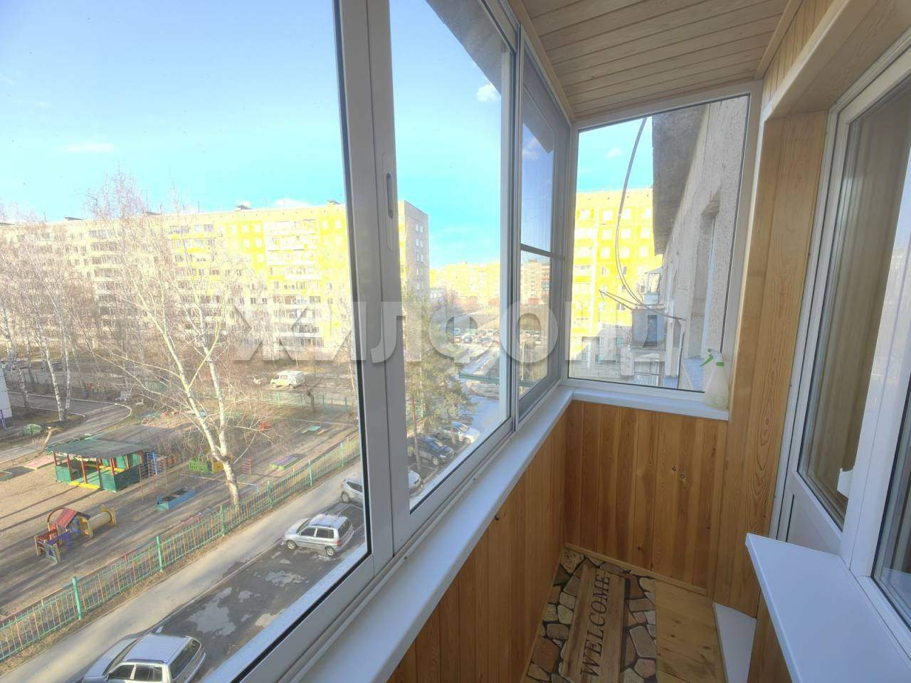Балкон обшит деревом и застеклён.
