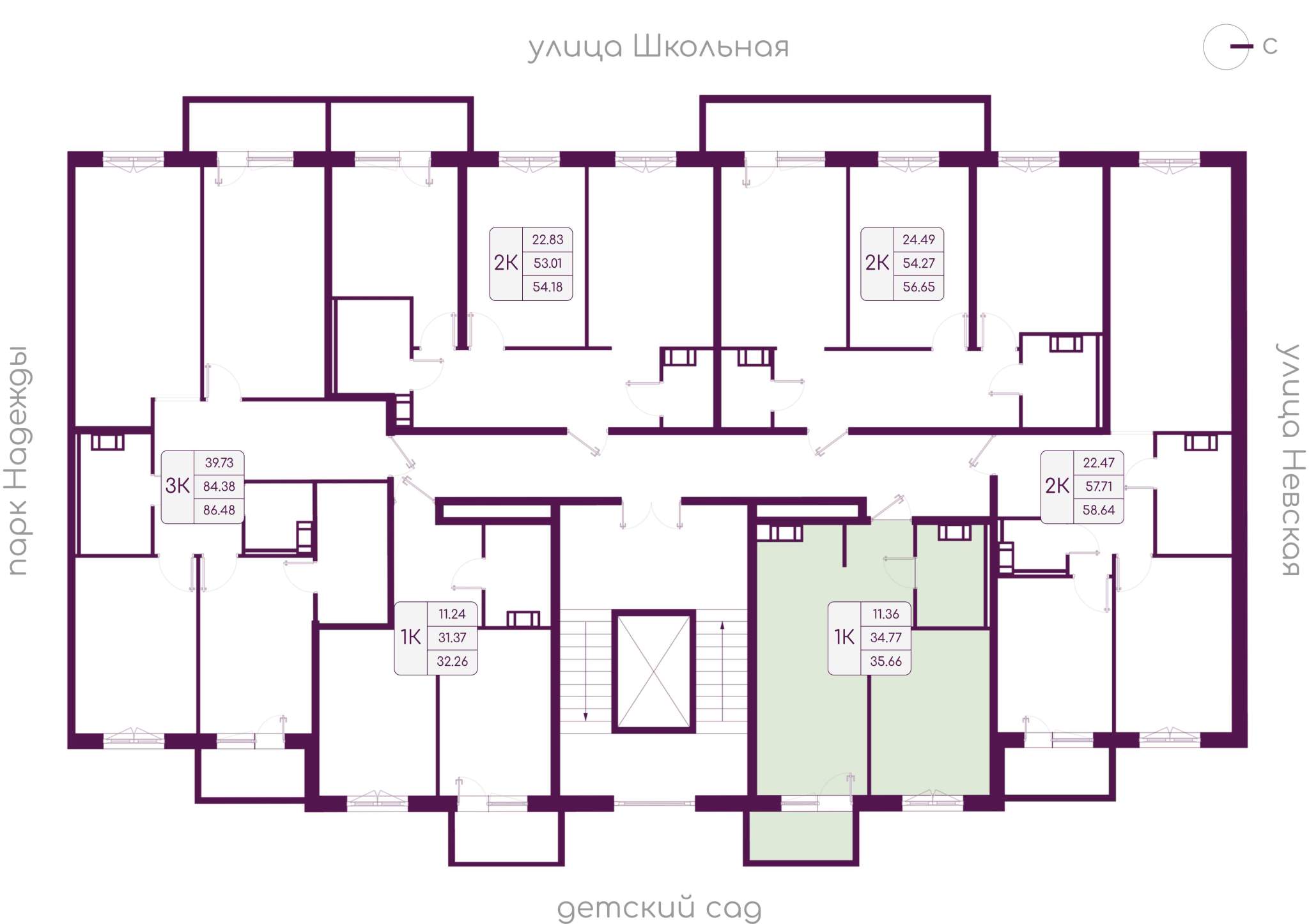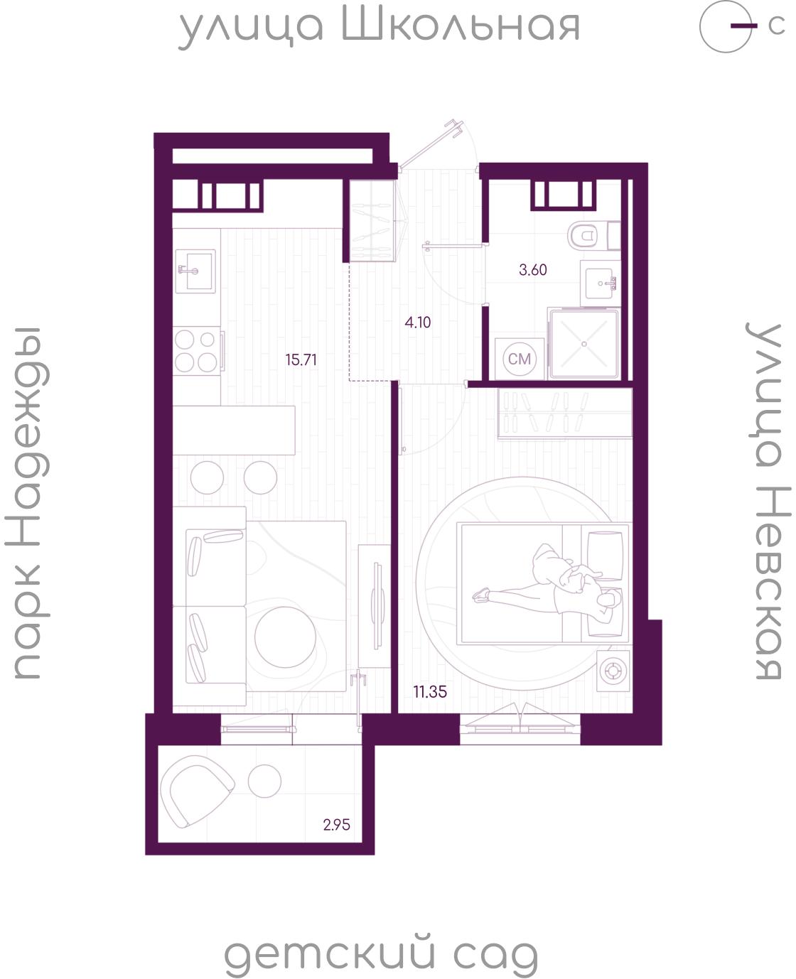 Жилая площадь 11.36 м2, кухня 15.71 м2, квартира без отделки, балконов - 1, окна выходят во двор.