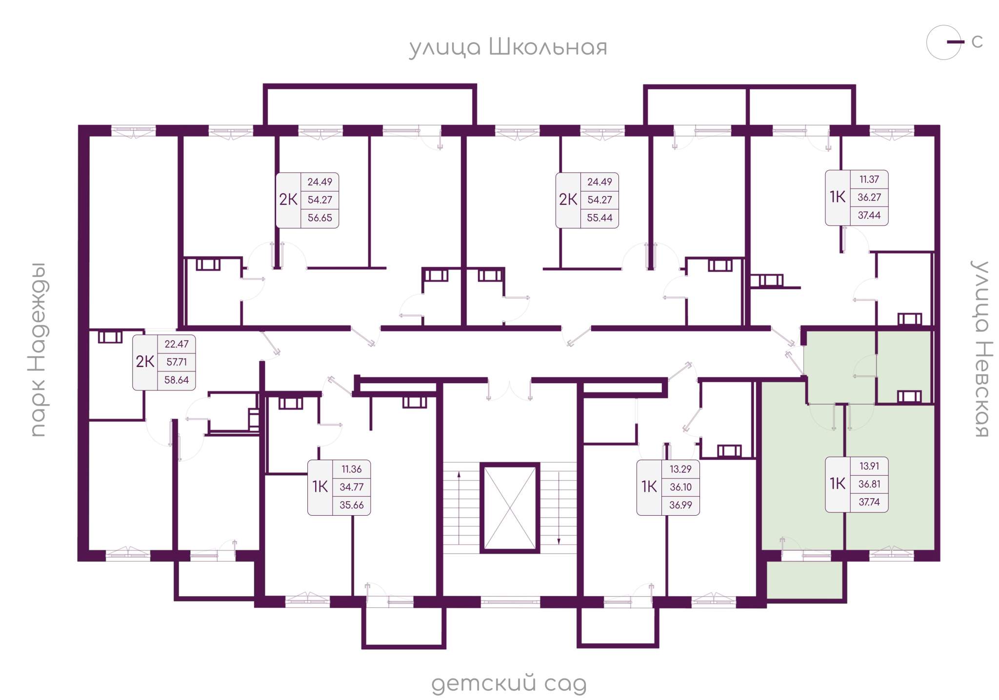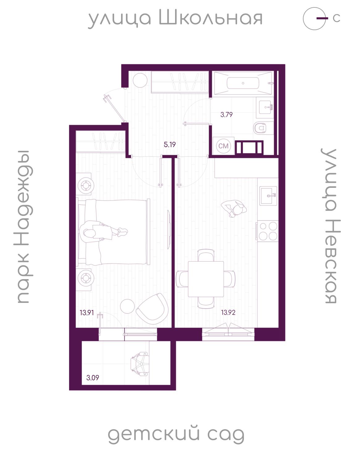 Жилая площадь 13.91 м2, кухня 13.92 м2, квартира без отделки, балконов - 1, окна выходят во двор.