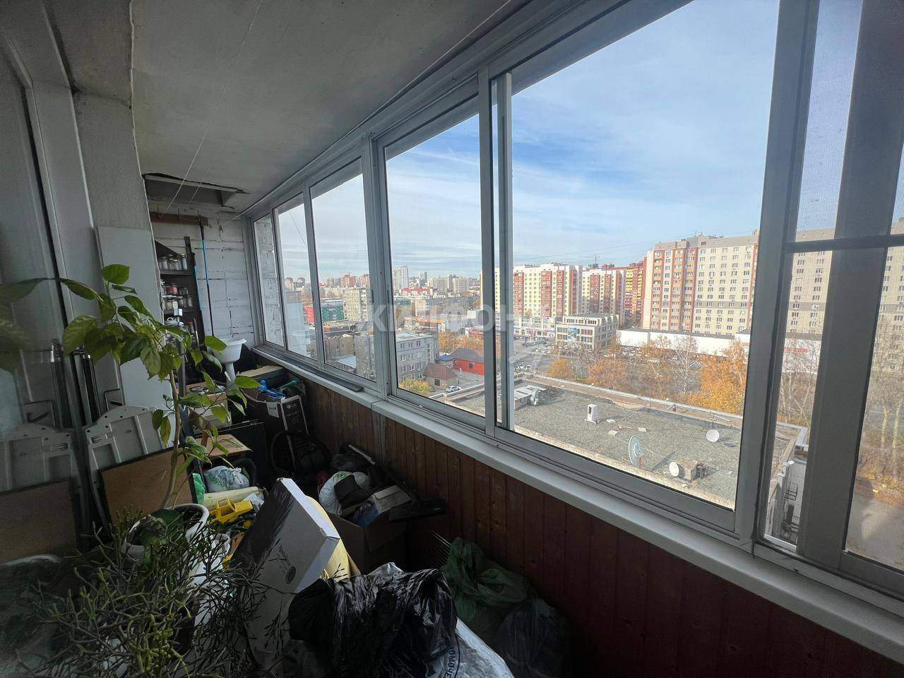 Большая лоджия остеклена, обшита вагонкой, окна выходят на улицу Богаткова, на солнечную сторону.