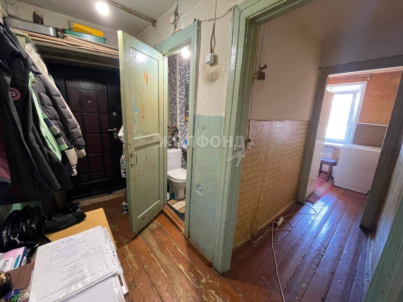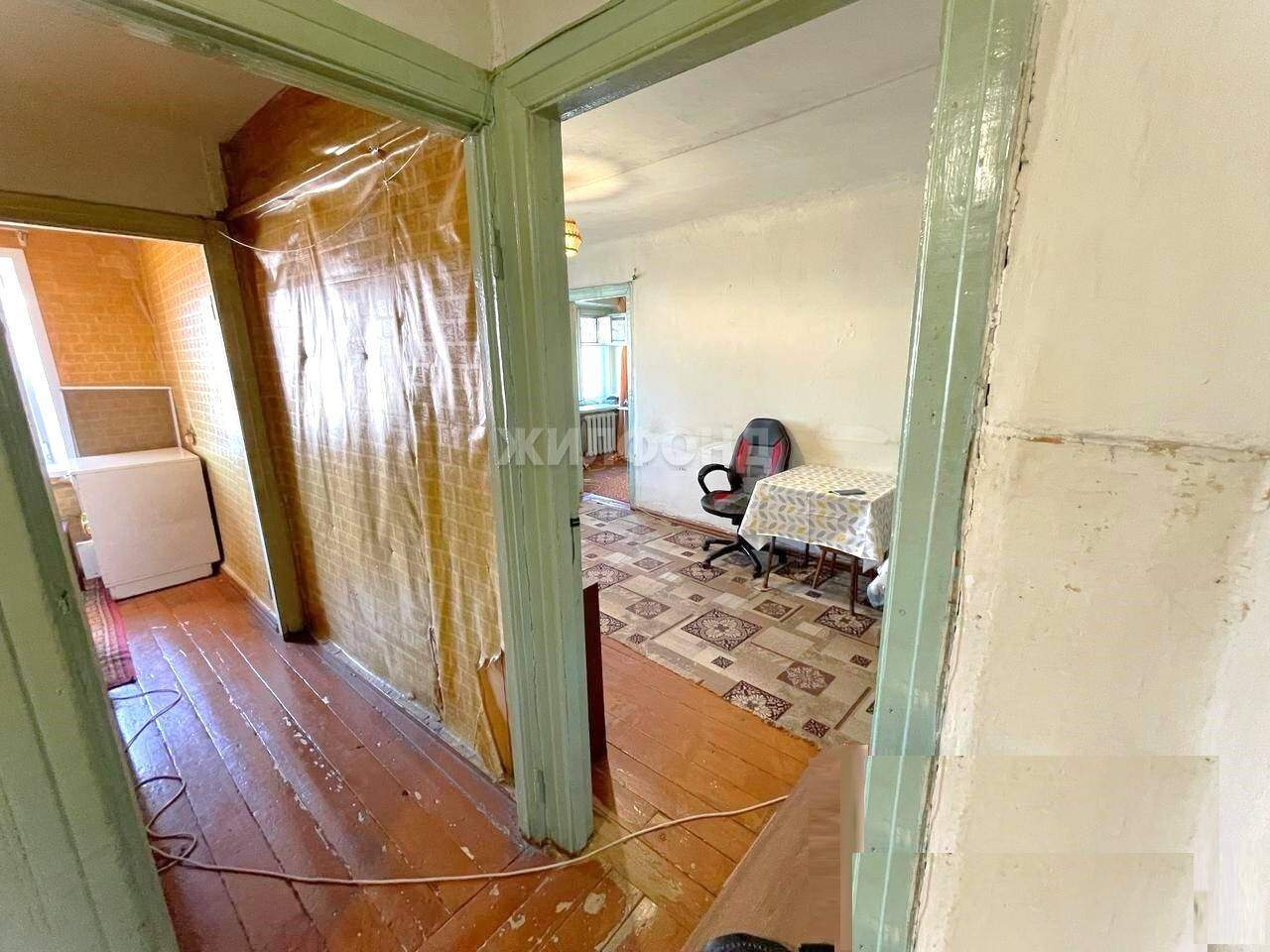 В квартире установлено 1 пластиковое окно (на кухне) , остальные два окна деревянные от застройщика. Межкомнатные двери от застройщика. Потолки в квартире побелены. Напольное покрытие - деревянная доска. Стены оклеены обоями.