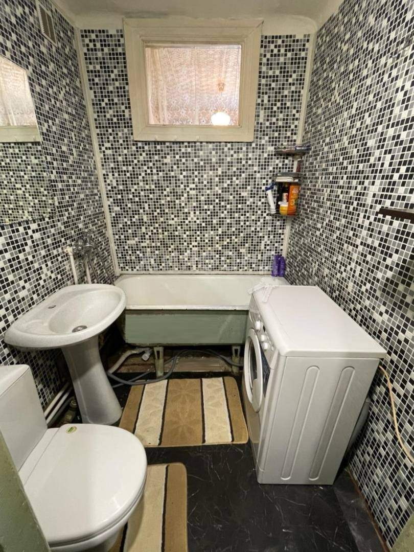 Стены и пол в ванной комнате отделаны кафелем. Ванна чугунная. установлены счетчики учета воды. Есть подводка для стиральной машинки. Санфаянс в отличном состоянии. .