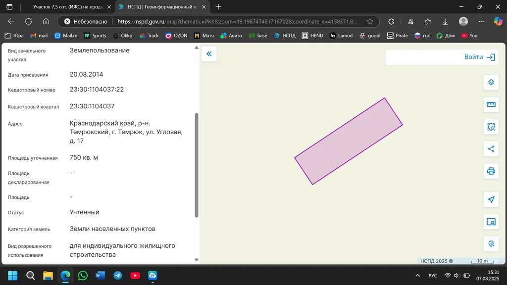 Площадь участка - 750 квадратных метров. Фасад - 15 метров. Категория земель - земли населённых пунктов. Вид разрешённого использования - для индивидуального жилищного строительства.