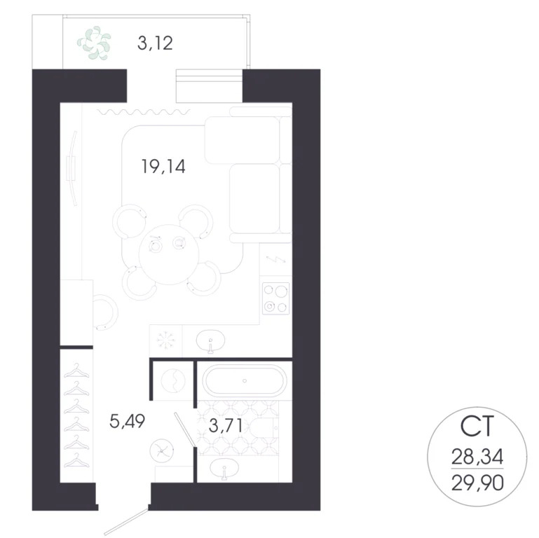 Общая площадь 29,9 кв.м.. Жилая 14,4кв.м.. Кухня 5 кв.м. С/у совмещенный Лоджия 3,12 кв.м.
