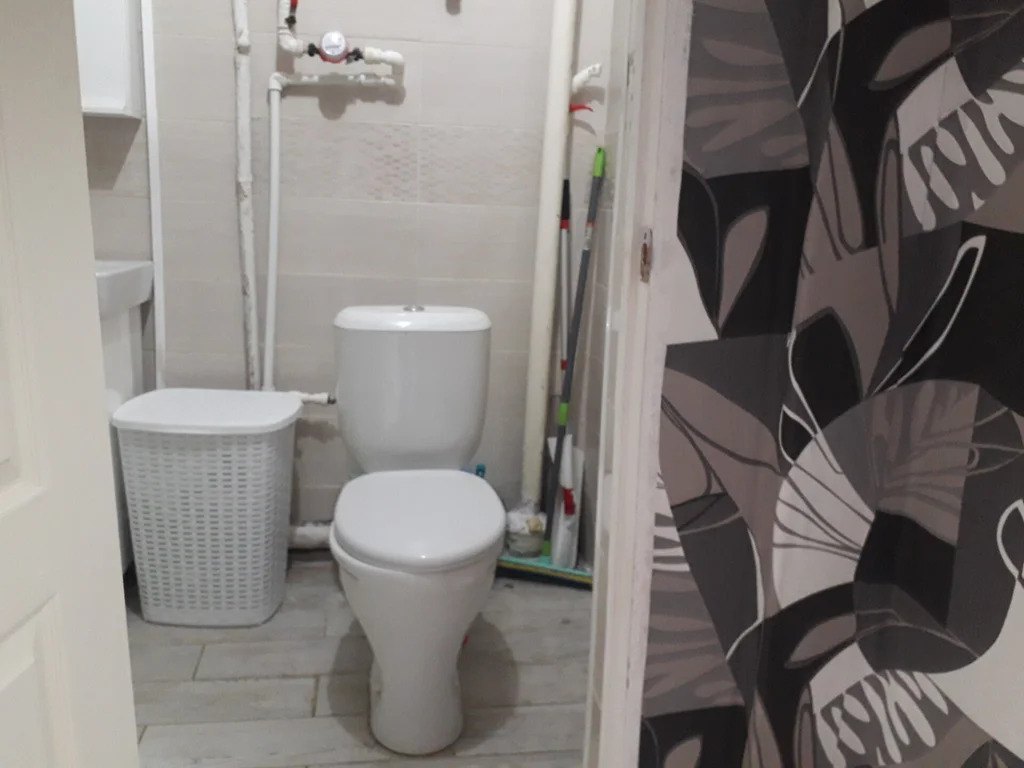 Совмещенный санузел обложен плиткой, которая гармонично сочетается с сантехникой.