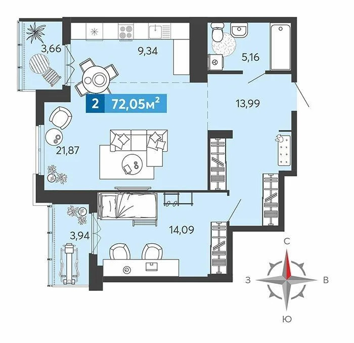 Общая площадь 72,05 кв.м. , жилая площадь 35,96 кв.м., кухня 9,40 кв. м. , с/у совмещен , лоджия 3,66 кв.м. Имеется выбор этажей и планировок .