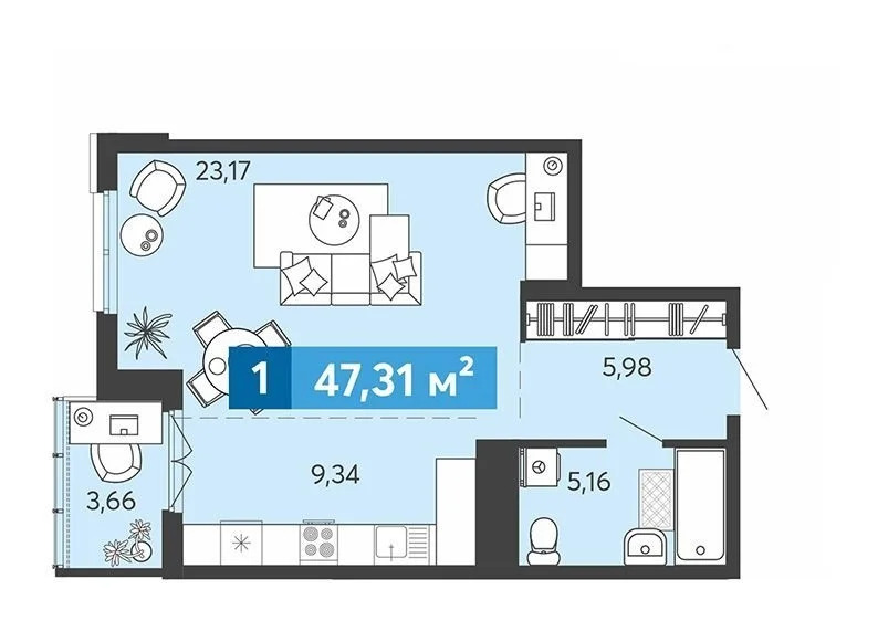 В наличии 1 комнатные квартиры : Общая площадь 47.31 м2 . Жилая площадь 23,17 м2 . Кухня 9,34 м2 . Имеется выбор этажей .