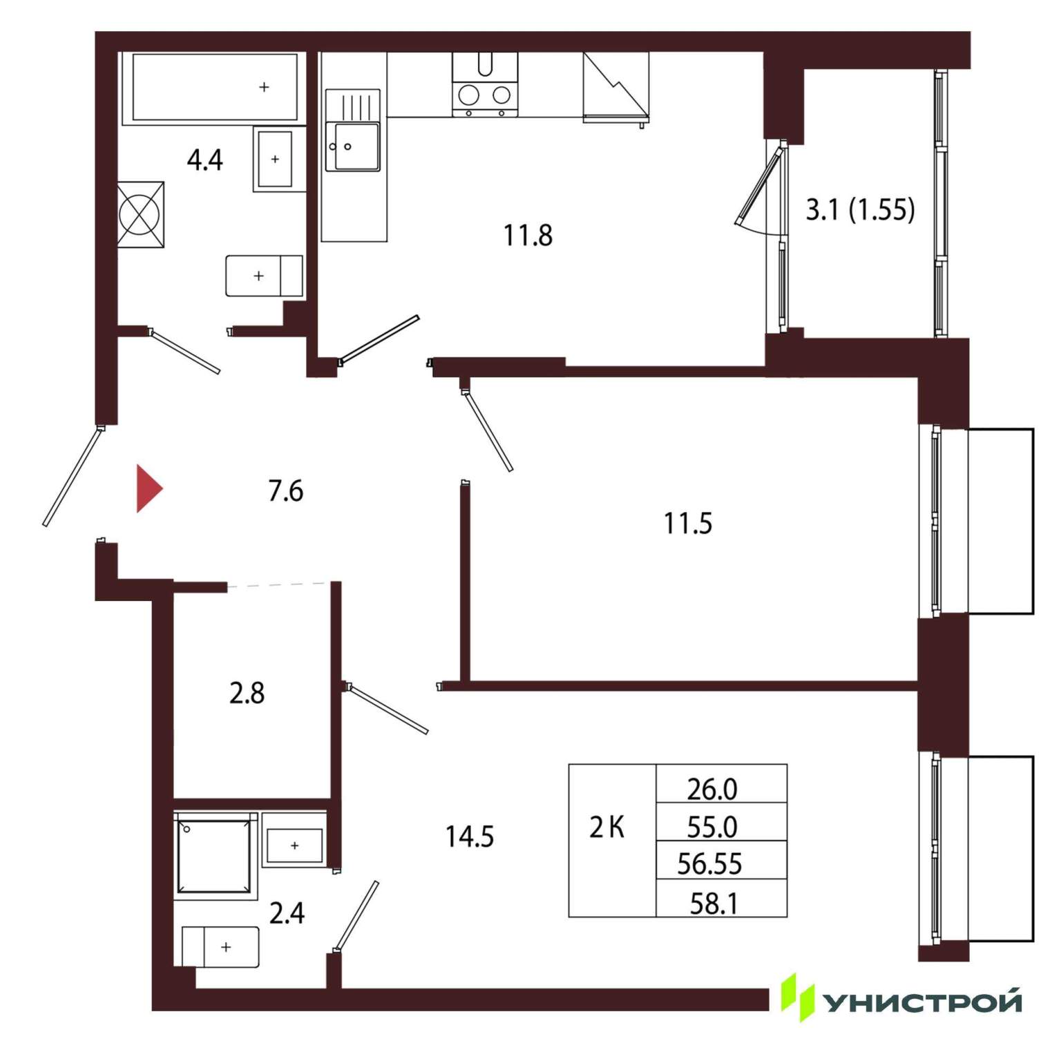 Жилая площадь 41.7 м2, кухня 16.86 м2. Площадь комнат: 14.96/13.73/13.01 м2. Раздельных санузлов - 1.