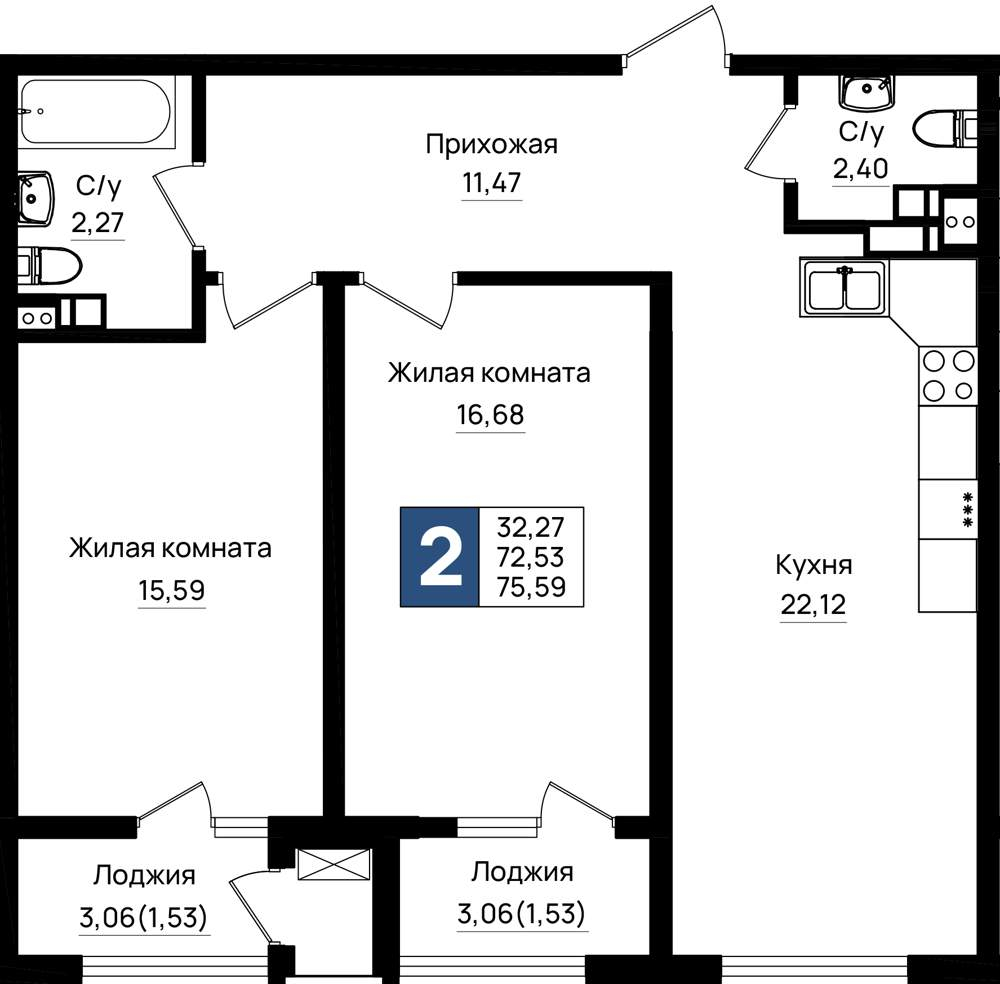 Жилая площадь 14.97 м2, кухня 16.7 м2, предчистовая отделка, комнаты изолированные.