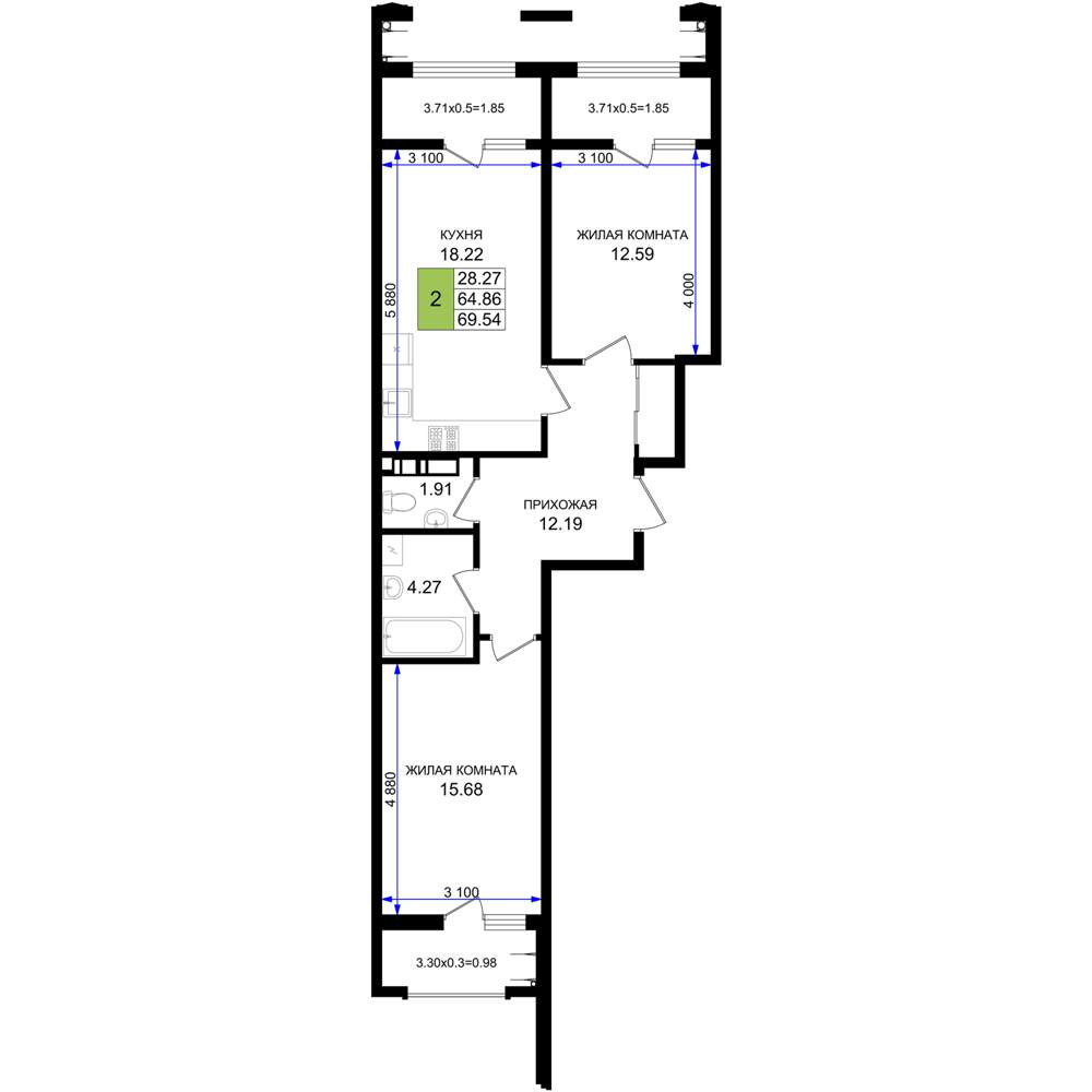 Жилая площадь 14.09 м2, кухня 18.2 м2, предчистовая отделка, комнаты изолированные.