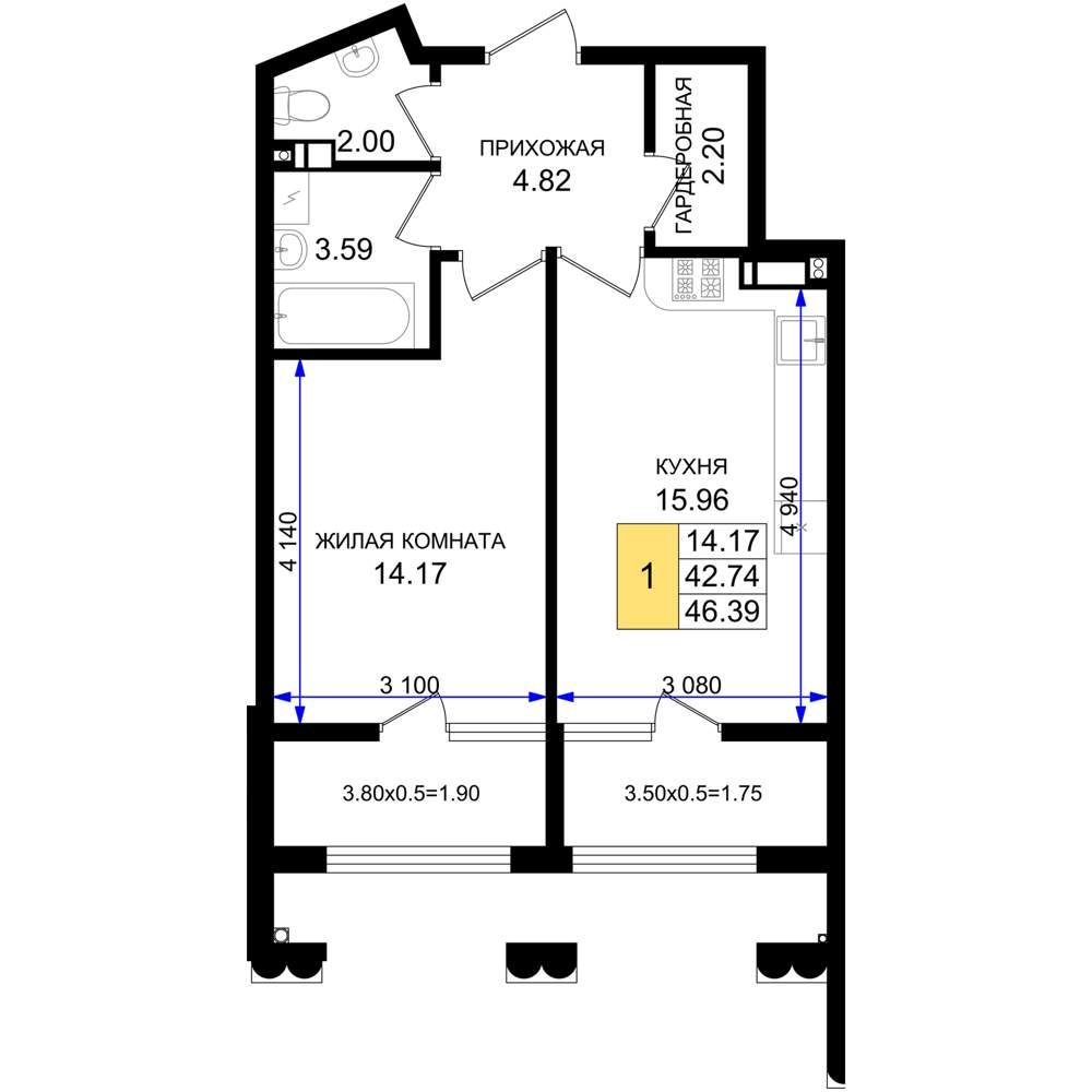 Жилая площадь 15.8 м2, кухня 15.79 м2, предчистовая отделка, комнаты изолированные.
