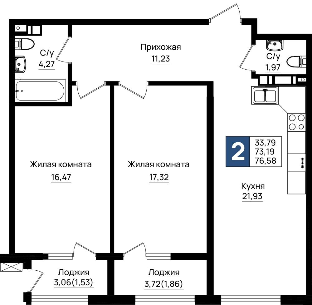 Жилая площадь 15.44 м2, кухня 22.63 м2, предчистовая отделка, комнаты изолированные.