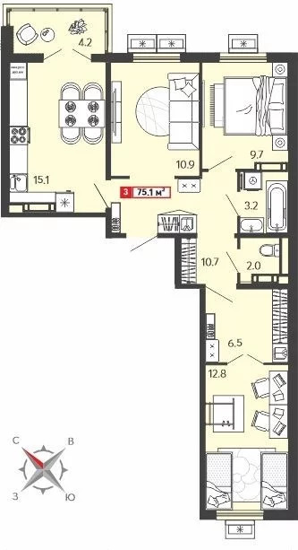 Два совмещенных санузла 4,4 кв. м. и 3,9 кв. м . Прихожая 6,7 кв.м . Лоджии 11,2 кв.м