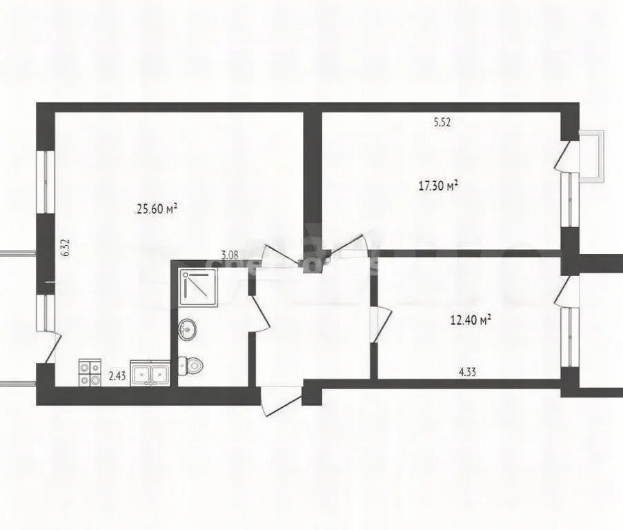 Удобнaя планиpовкa:пpocтоpнaя кухня-гоcтинaя - 25.6 м2, cпальня - 17.3 м2 с выходoм нa французский балкон, комнaтa - 12.4 м2 c выходом на балкон, приxoжая - 7.2 м2. высoта потолка - 2.7 м2, санузел совмещенный - 5 м2. Отопление - централизованное, собственная котельная, горячая вода централизованная.