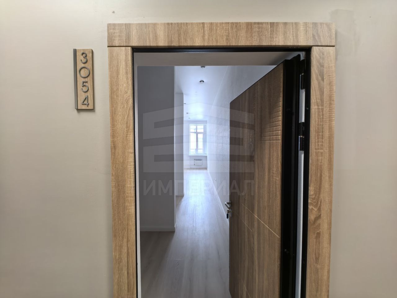 На стенах поклеены обои под покраску, на полу постелен ламинат с плинтусами и откосами. Есть вытяжная вентиляция в санузле и на кухне, выходы хв/гв, место под раковину на кухне. Кроме того, в помещениях уже есть выключатели освещения, розетки для бытовой техники и роутера, а также сделаны закладные для оптоволокна для интернета.