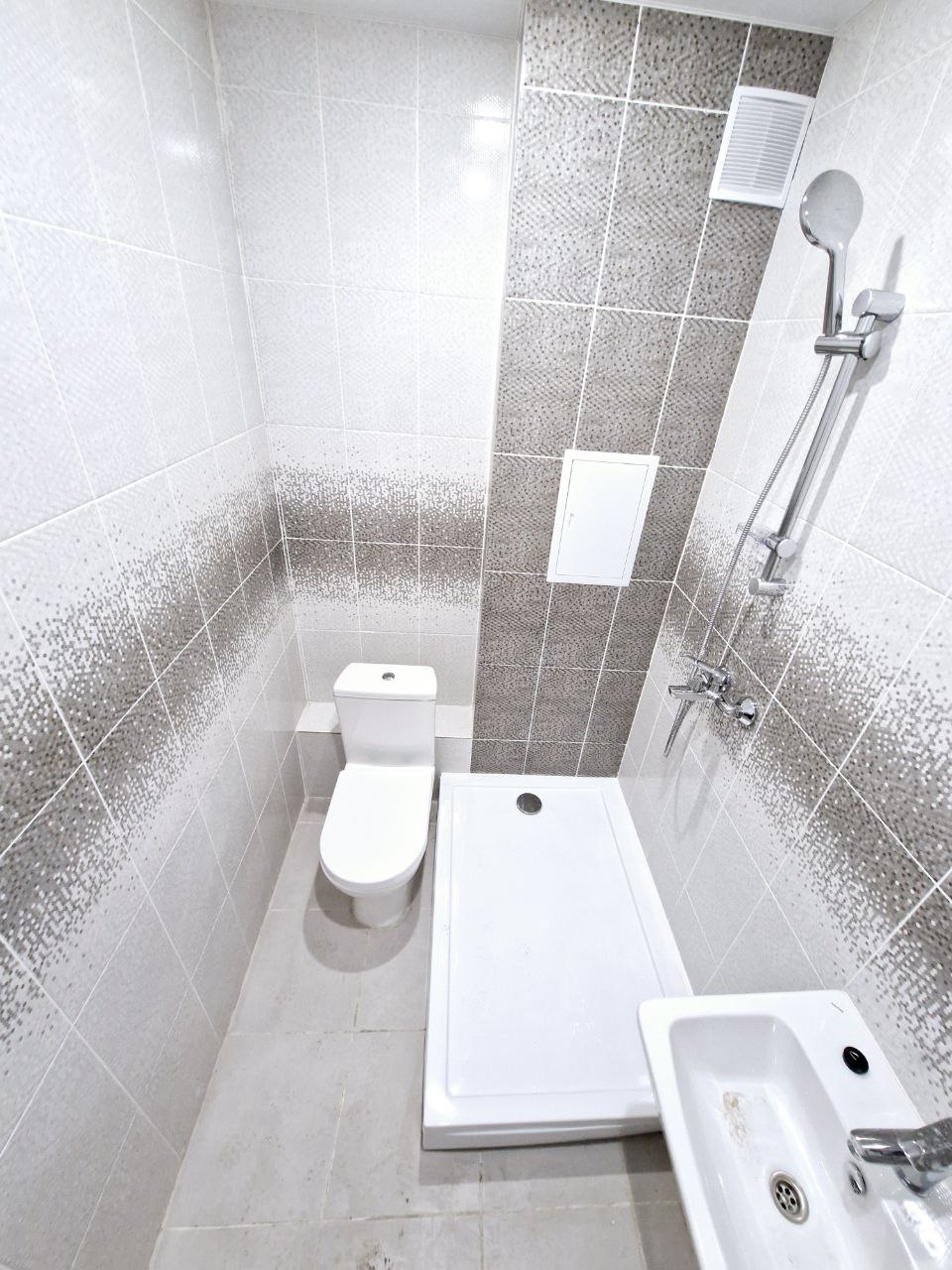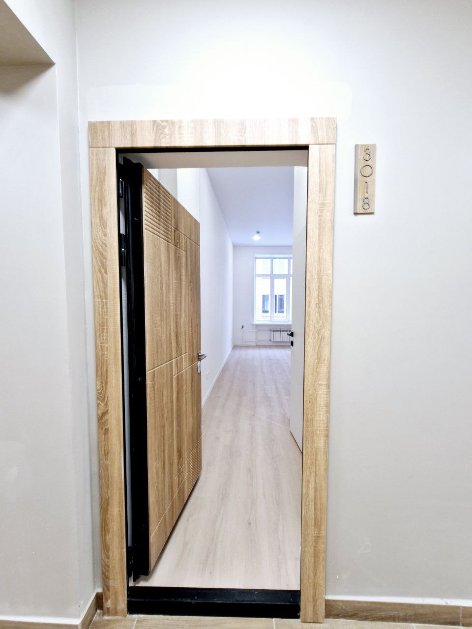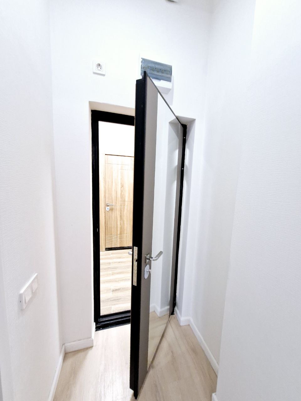 На стенах поклеены обои под покраску, на полу постелен ламинат с плинтусами и откосами. Есть вытяжная вентиляция в санузле и на кухне, выходы хв/гв, место под раковину на кухне. Кроме того, в помещениях уже есть выключатели освещения, розетки для бытовой техники и роутера, а также сделаны закладные для оптоволокна для интернета.