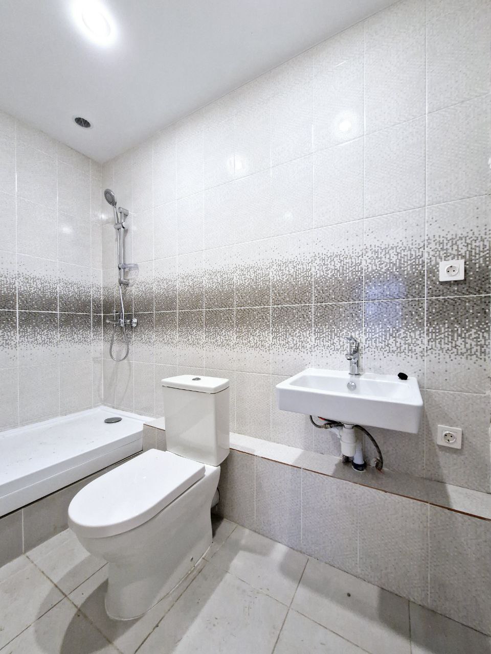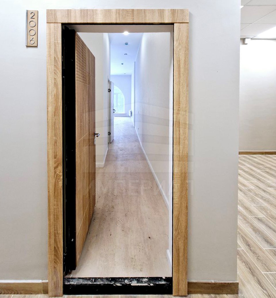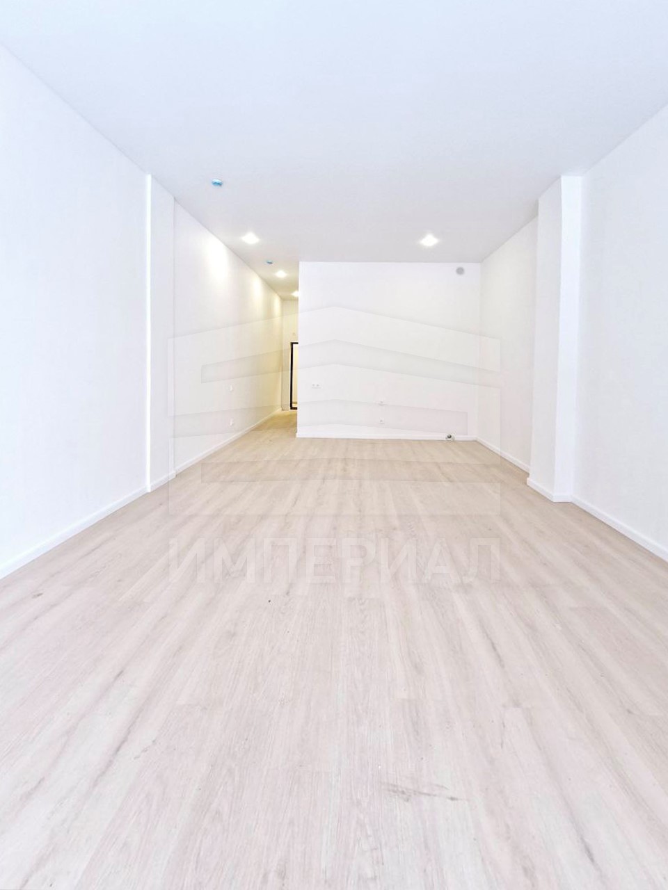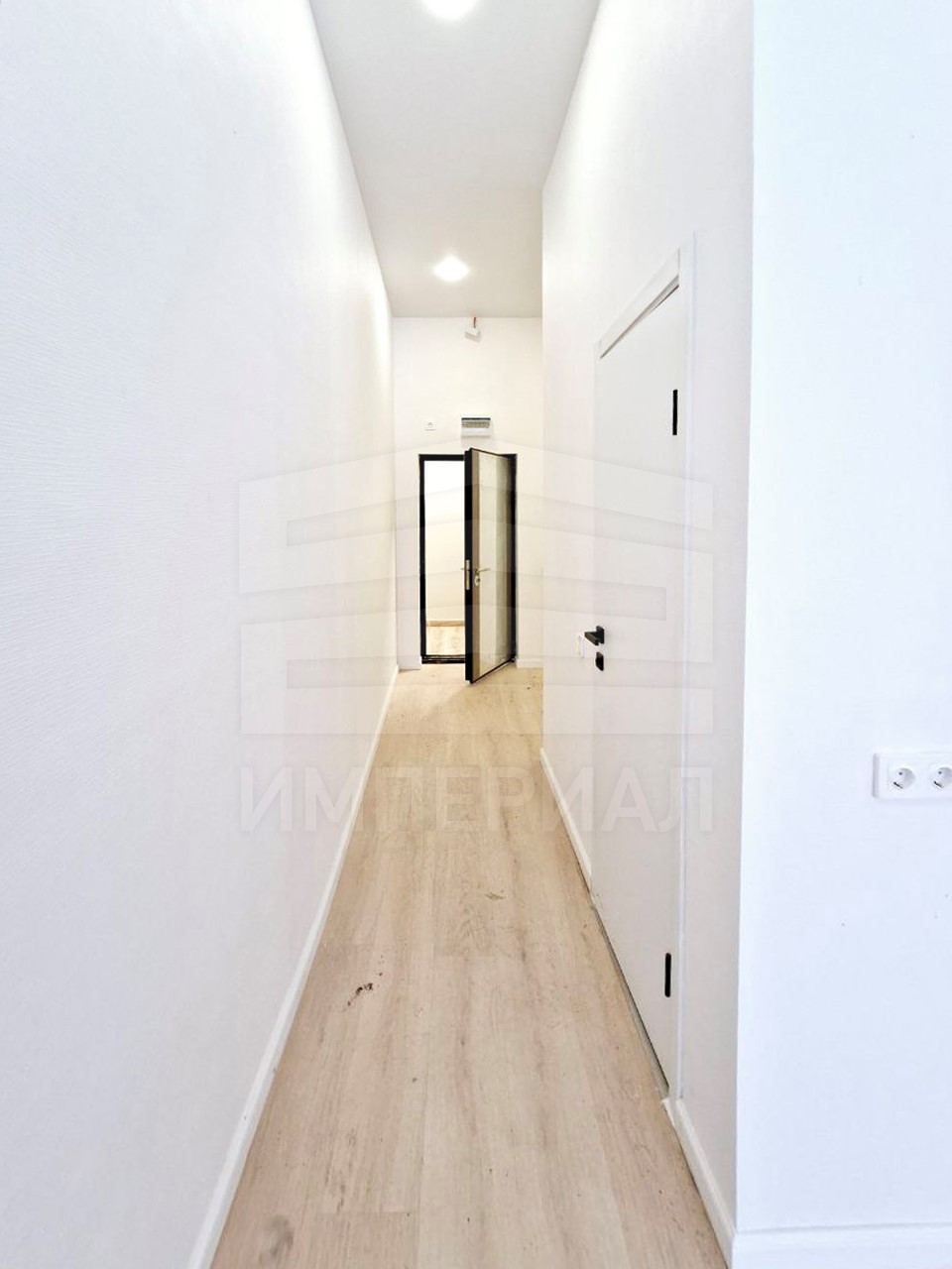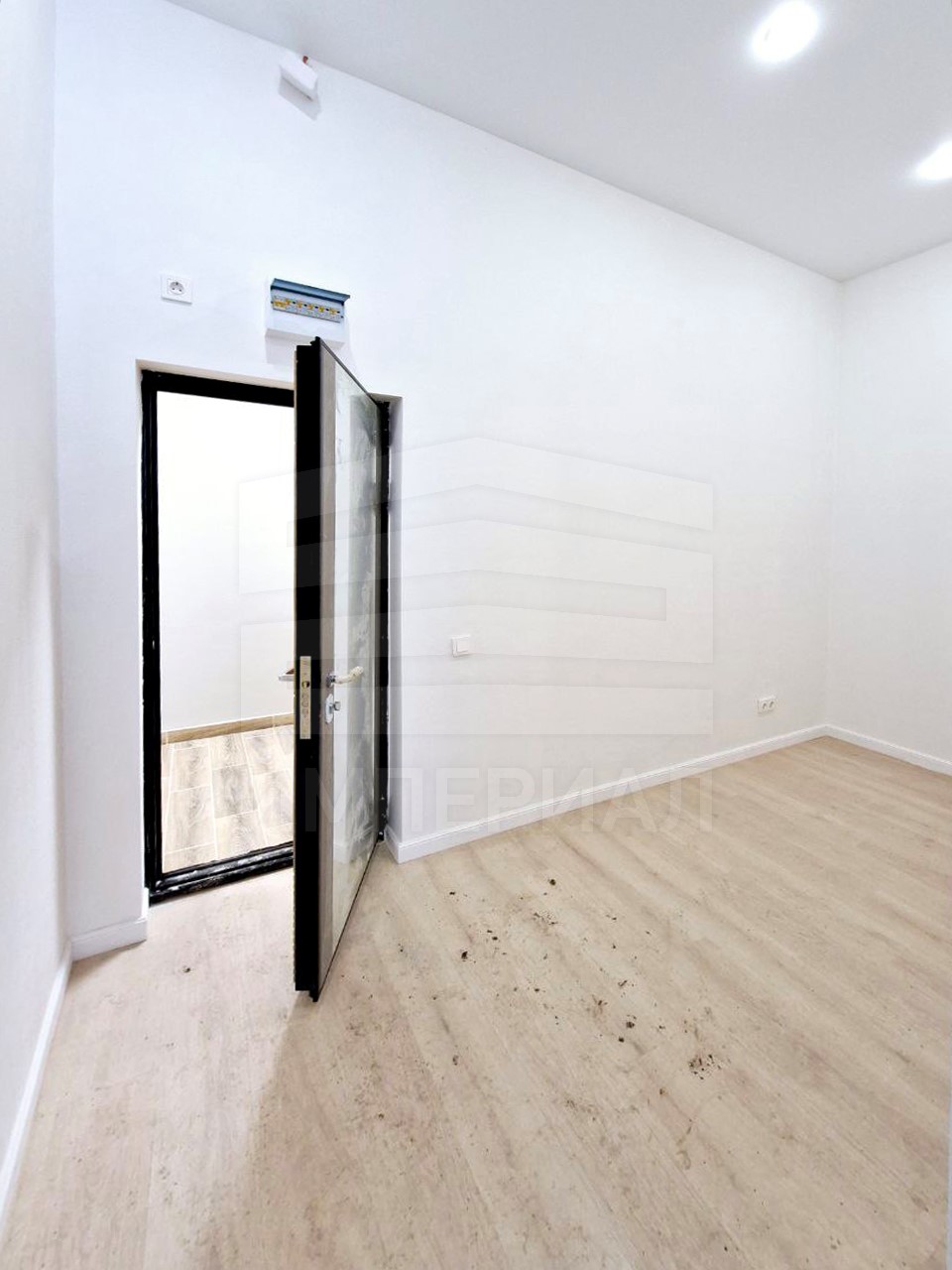 На стенах поклеены обои под покраску, на полу постелен ламинат с плинтусами и откосами. Есть вытяжная вентиляция в санузле и на кухне, выходы хв/гв, место под раковину на кухне. Кроме того, в помещениях уже есть выключатели освещения, розетки для бытовой техники и роутера, а также сделаны закладные для оптоволокна для интернета.