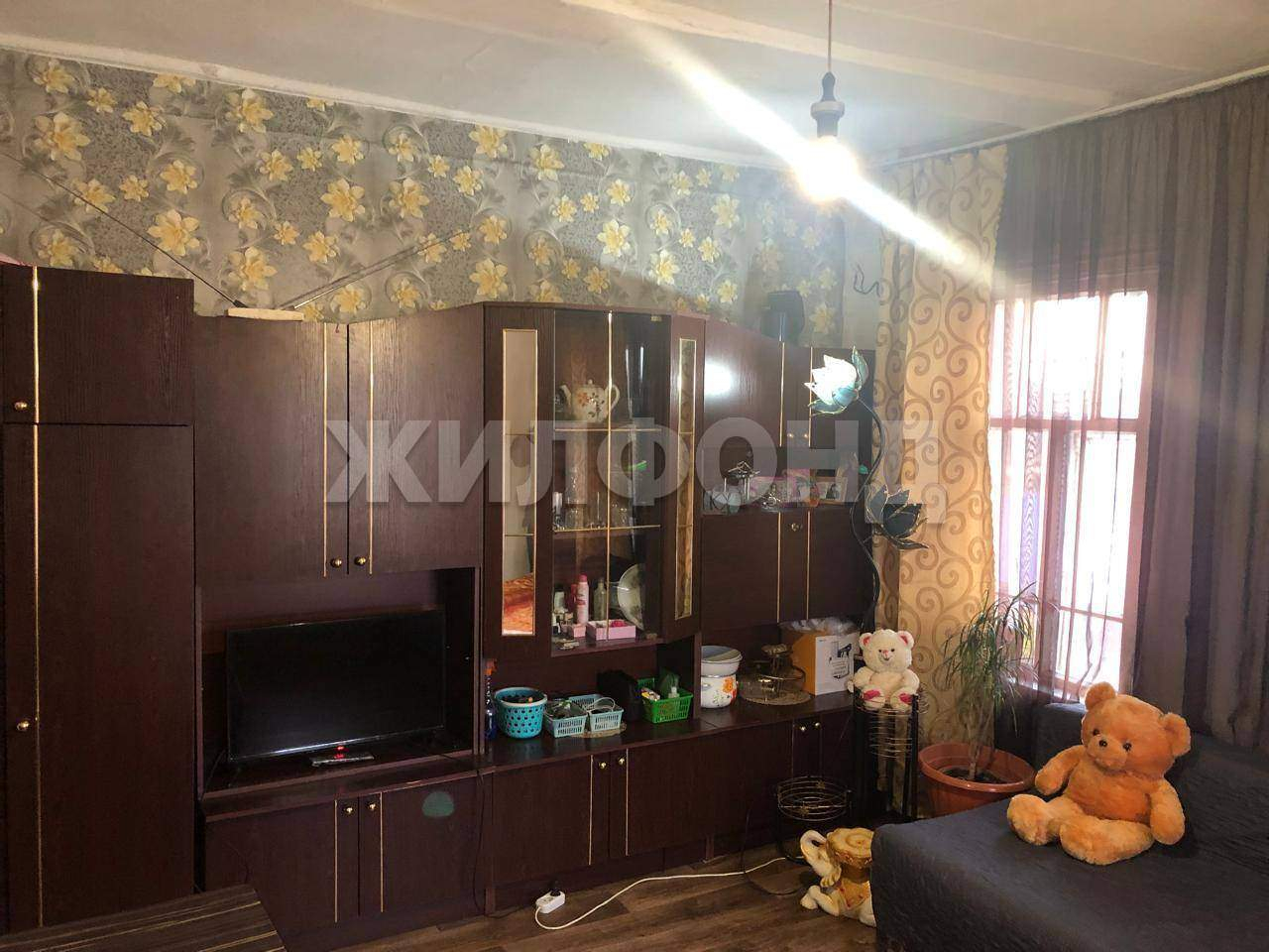 Квартира расположена на 2-м этаже брусового 2-этажного дома, печное отопление (1 ведро в сутки) , на полу линолеум, стены оштукатурены, частично с обоями, высокие потолки оштукатурены.