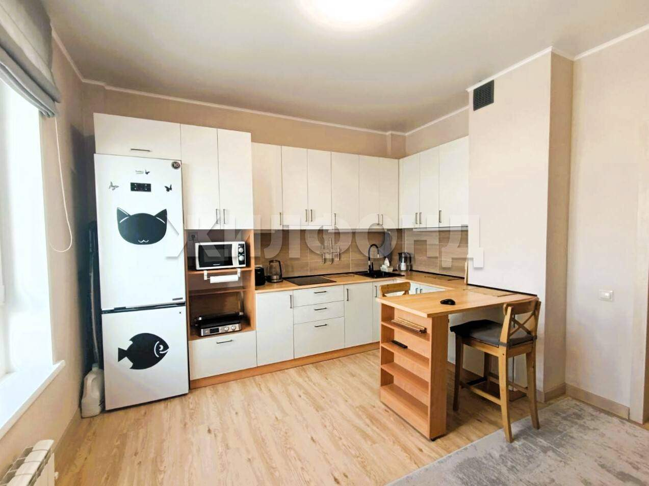 Ремонт выполнен качественными материалами и в актуальных оттенках. Высокие потолки, достаточно просторная гостиная и кухня с большими окнами создают ощущение света и простора.