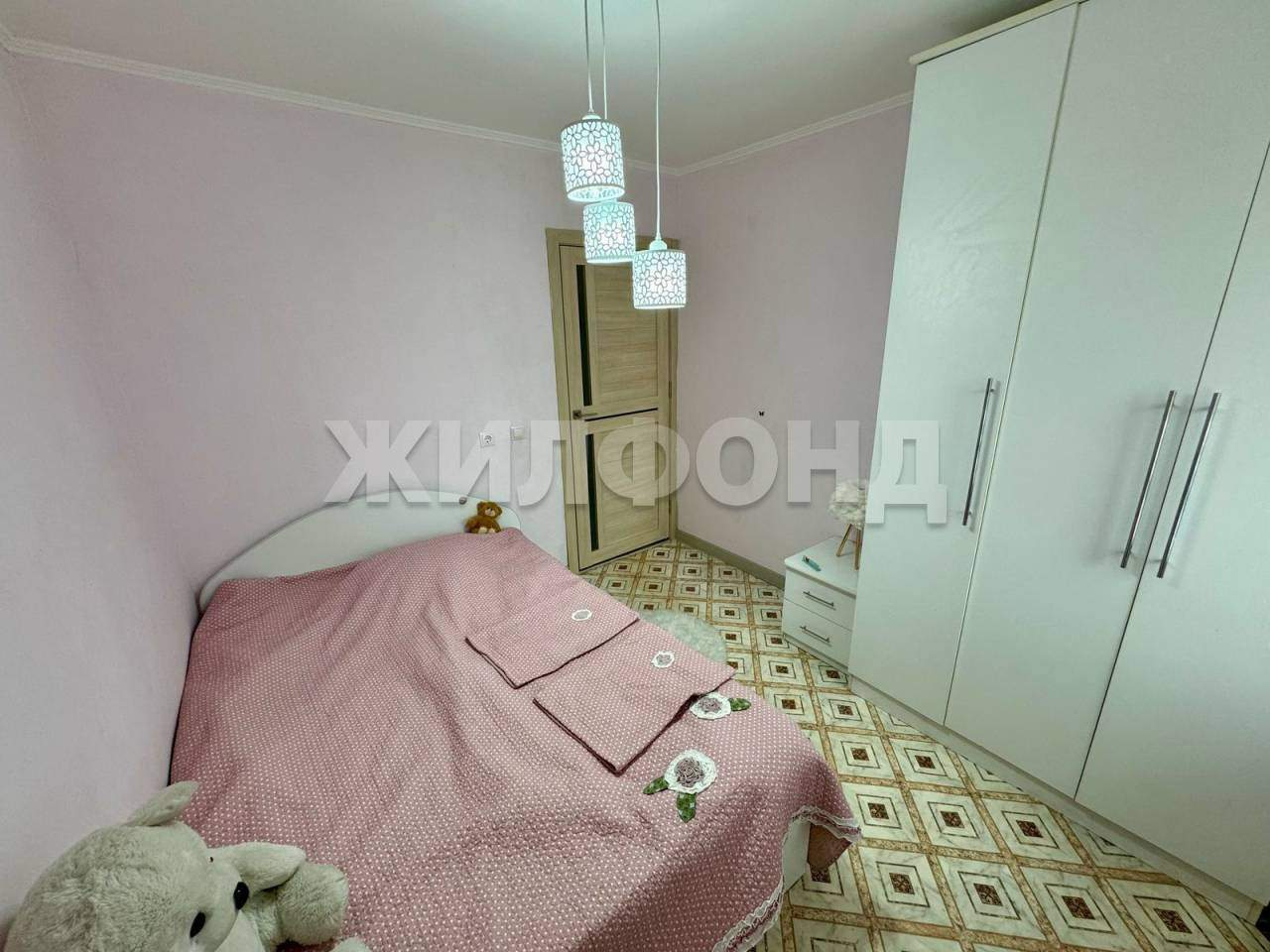 Косметический ремонт в пастельных тонах, на полу линолеум, на стенах обои.