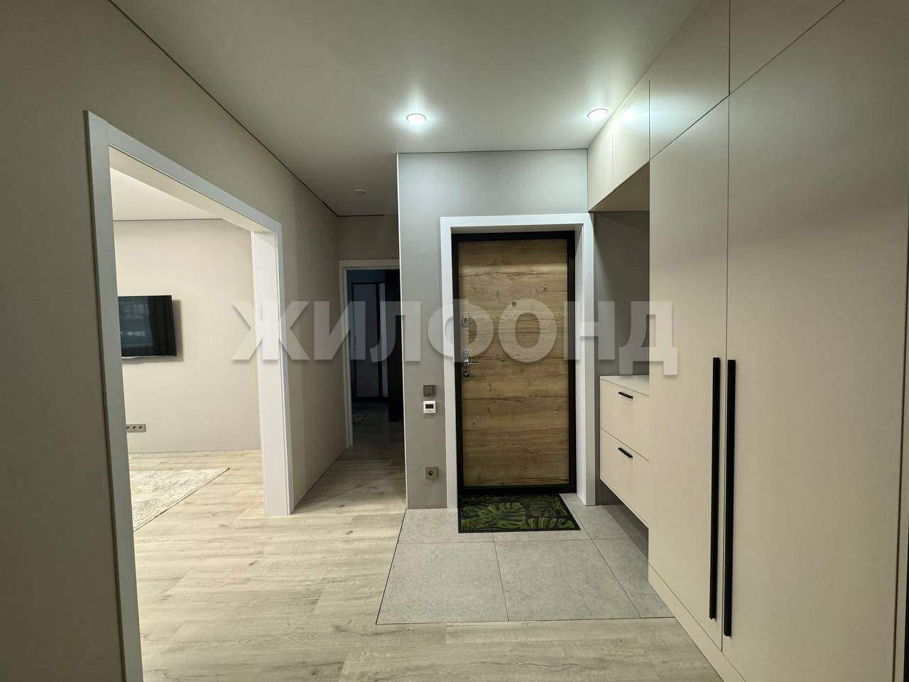 Просторный коридор с встроенной гардеробной системой.
