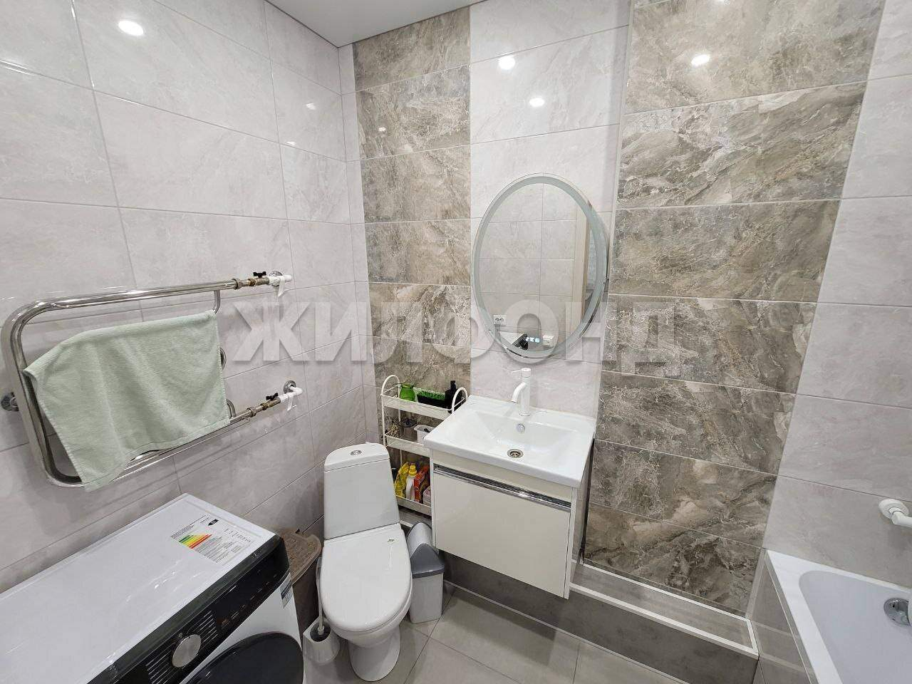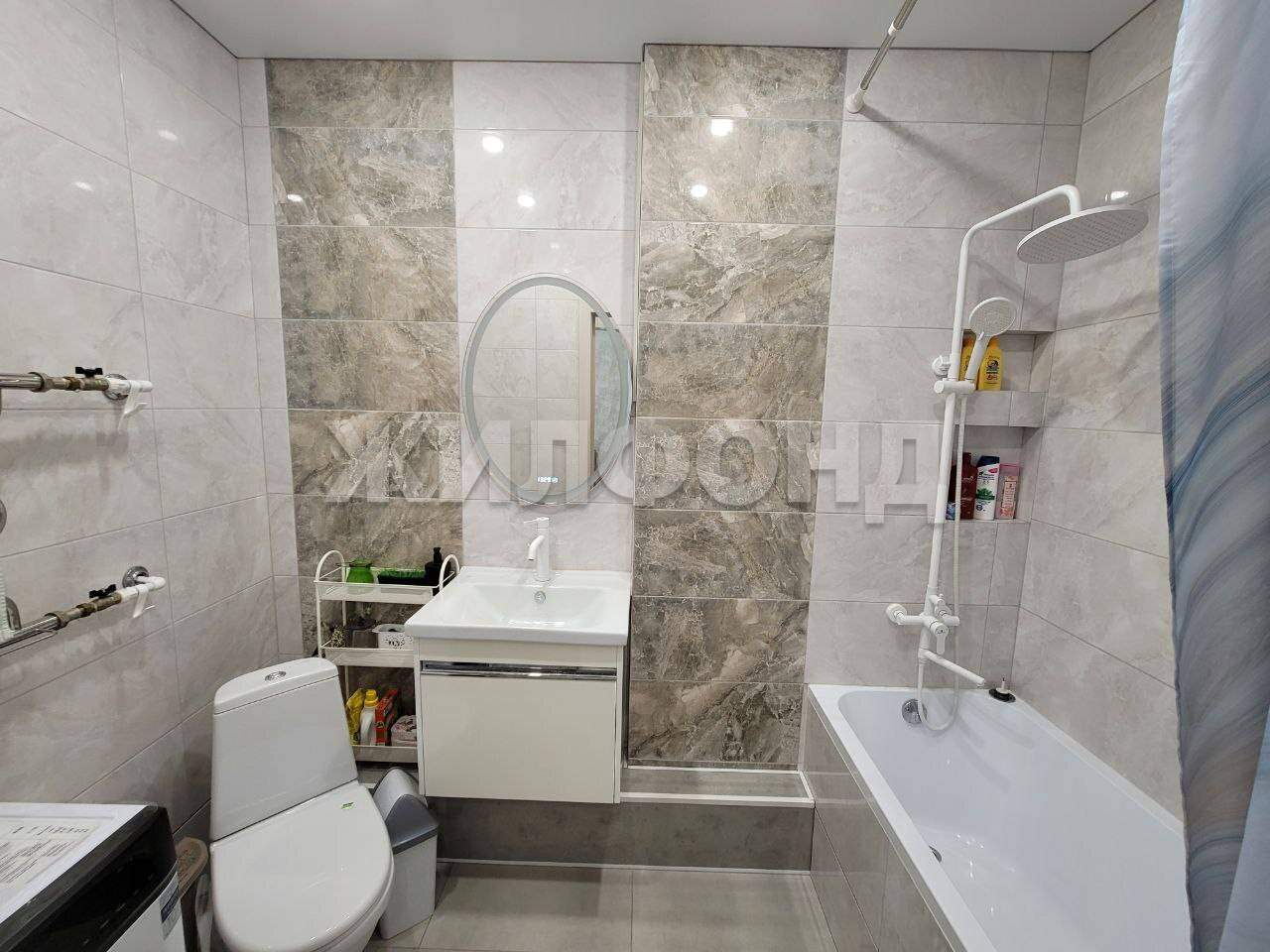 Аккуратный санузел отделан кафелем, который создаёт ощущение свежести и чистоты.