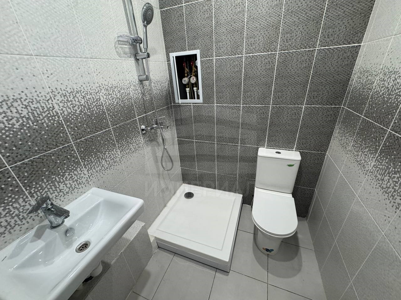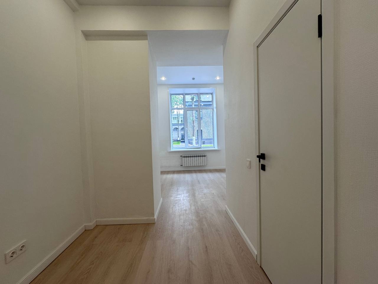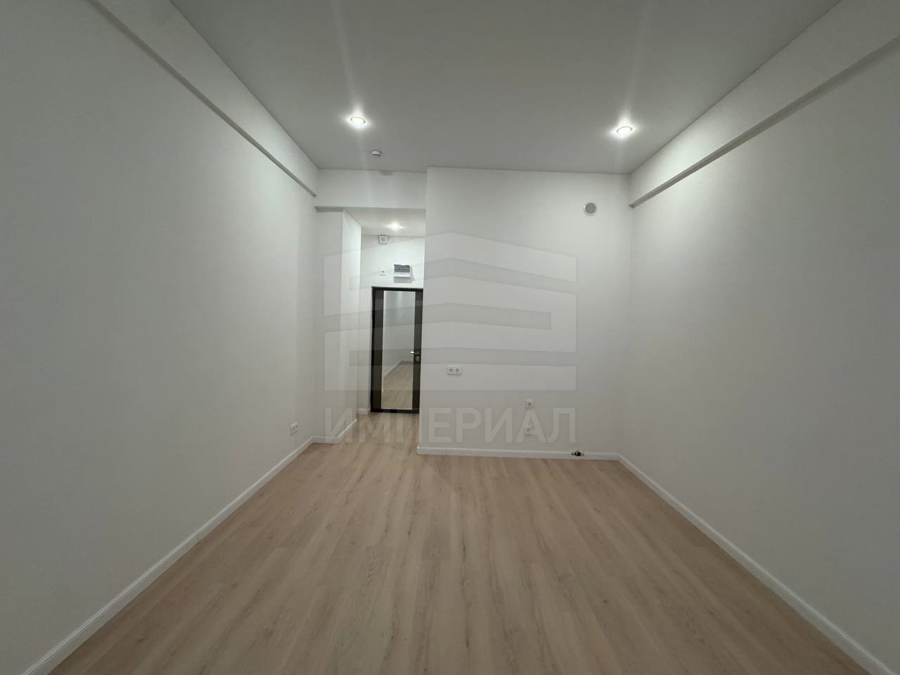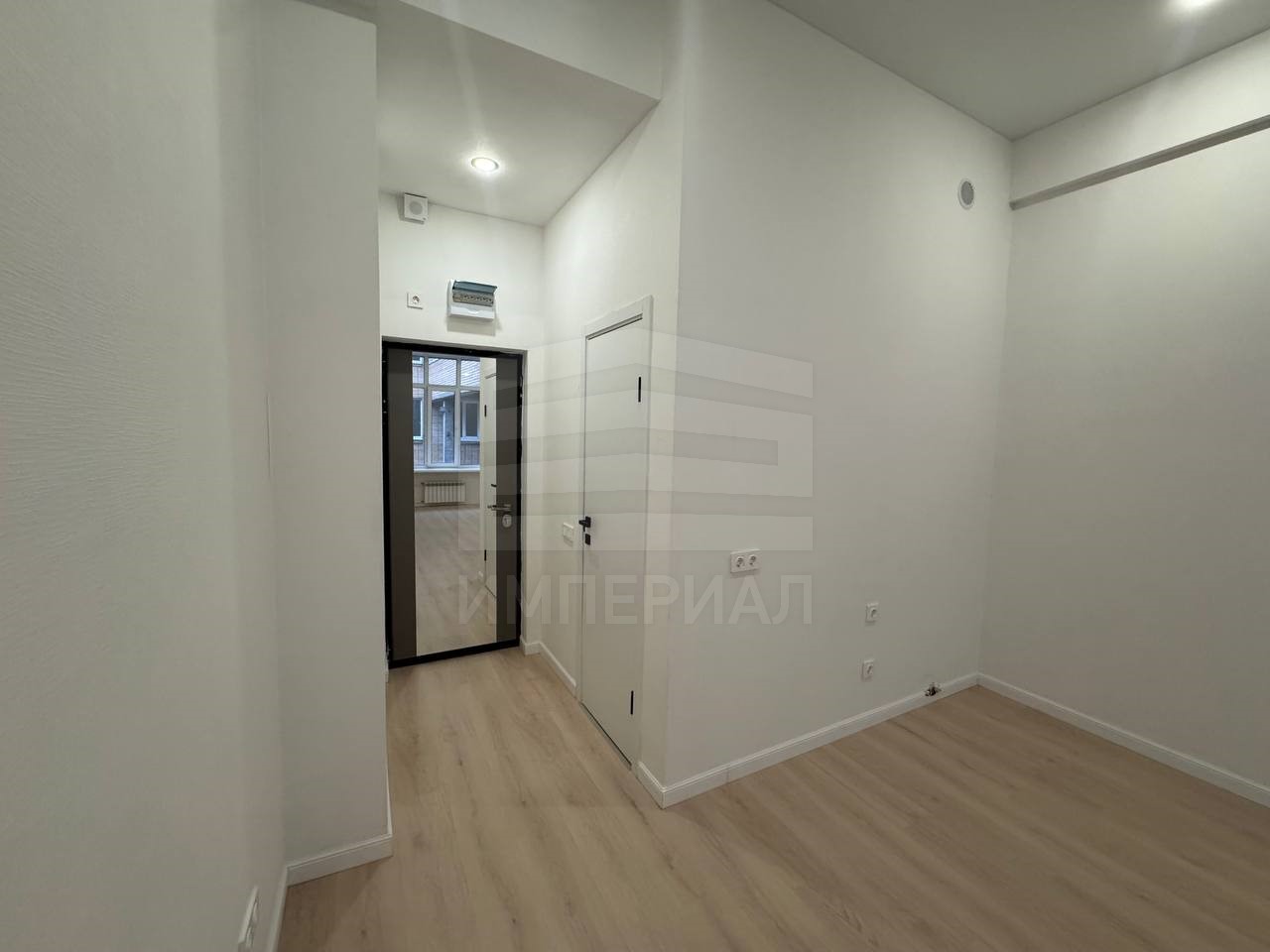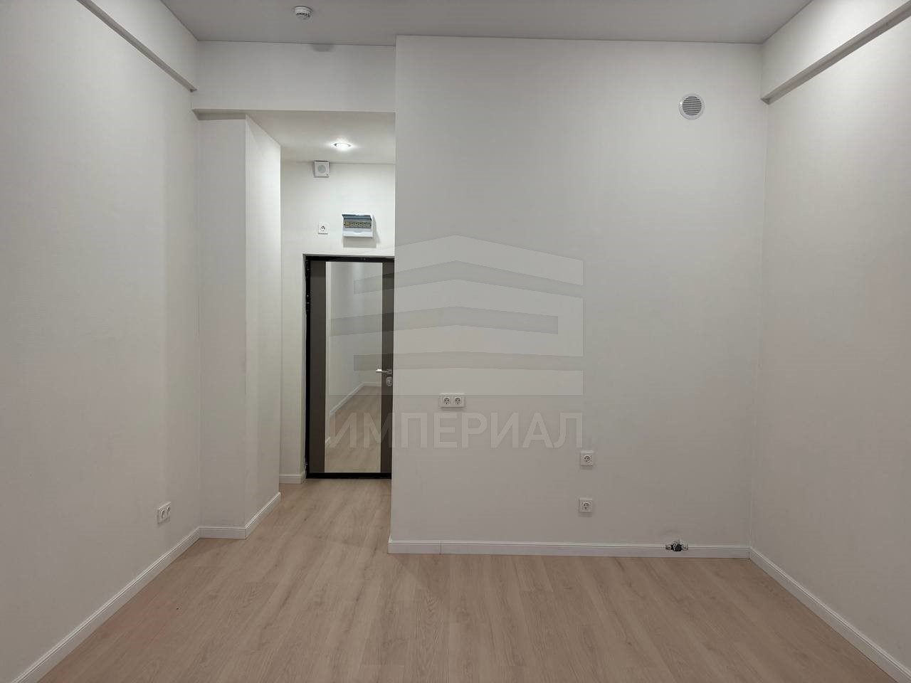 На стенах поклеены обои под покраску, на полу постелен ламинат с плинтусами и откосами. Есть вытяжная вентиляция в санузле и на кухне, выходы хв/гв, место под раковину на кухне. Кроме того, в помещениях уже есть выключатели освещения, розетки для бытовой техники и роутера, а также сделаны закладные для оптоволокна для интернета.