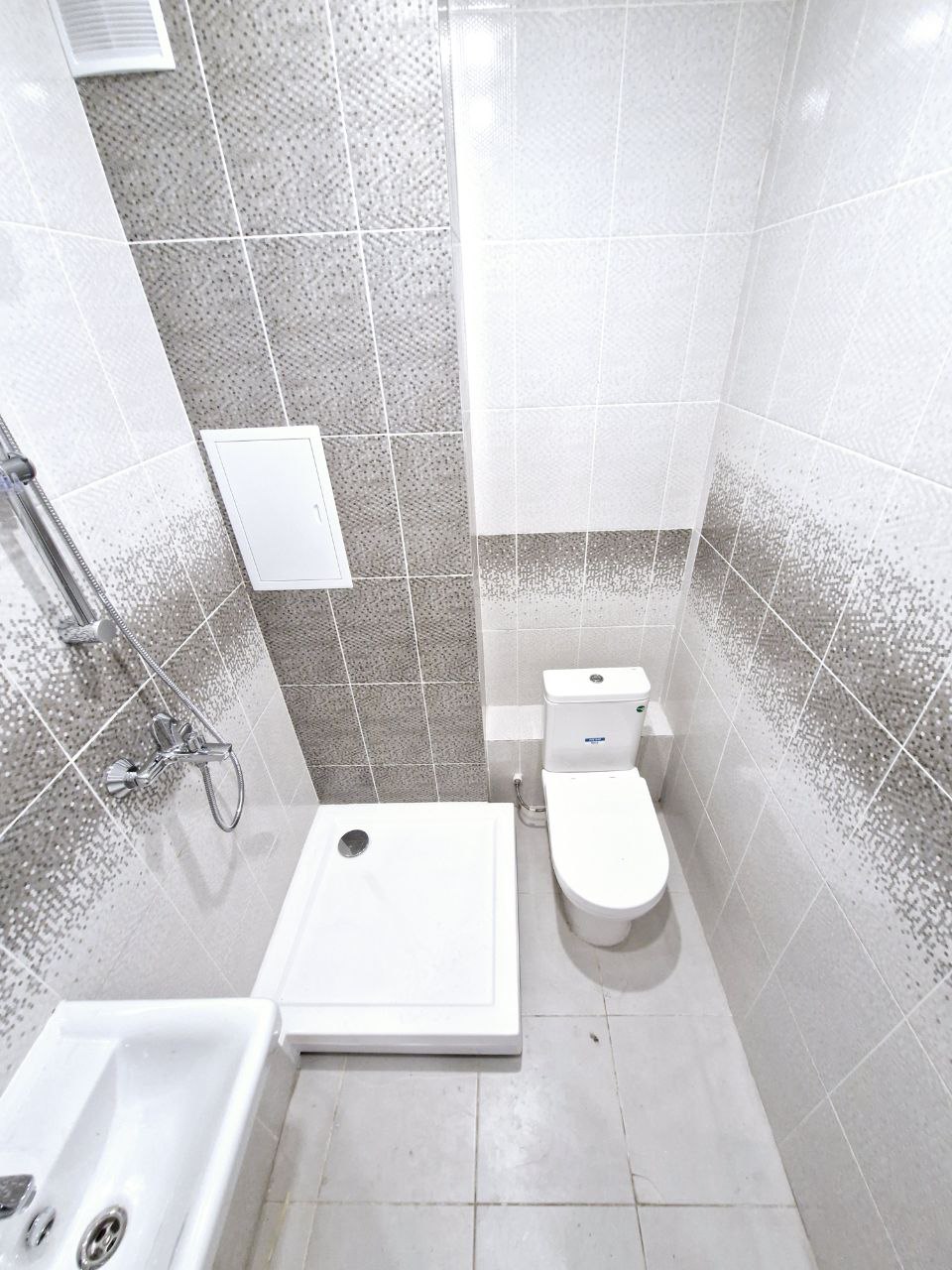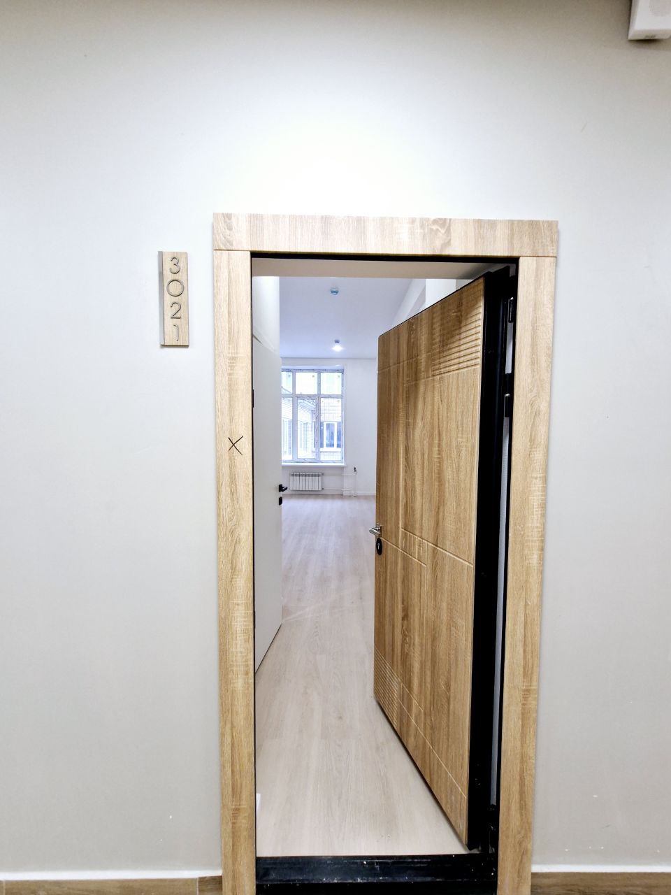 На стенах поклеены обои под покраску, на полу постелен ламинат с плинтусами и откосами. Есть вытяжная вентиляция в санузле и на кухне, выходы хв/гв, место под раковину на кухне. Кроме того, в помещениях уже есть выключатели освещения, розетки для бытовой техники и роутера, а также сделаны закладные для оптоволокна для интернета.