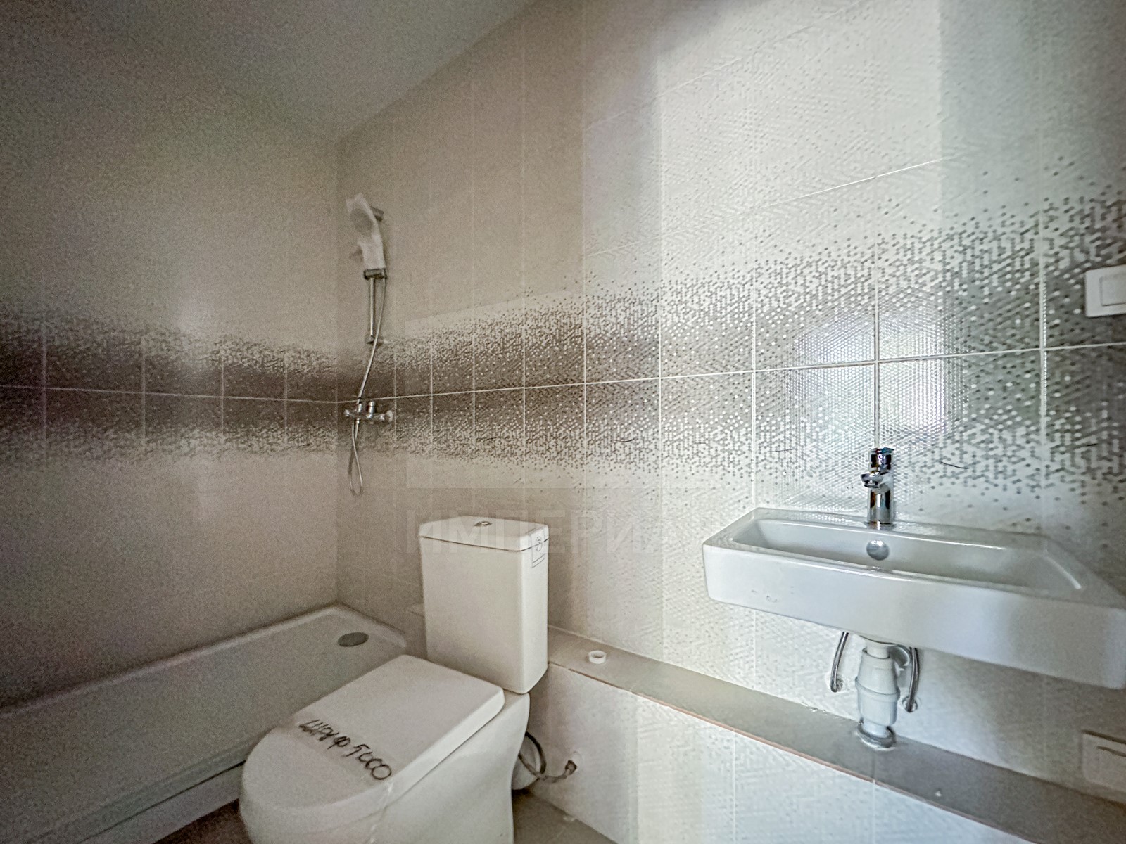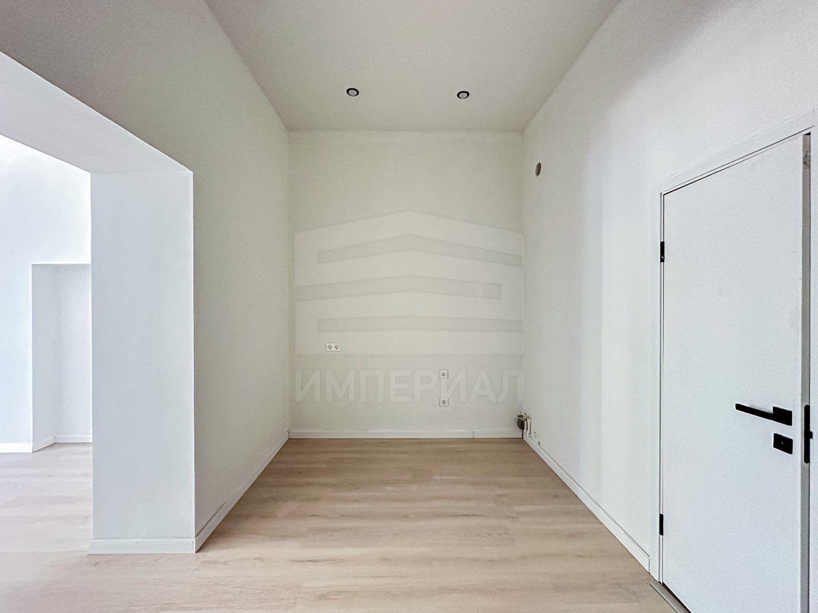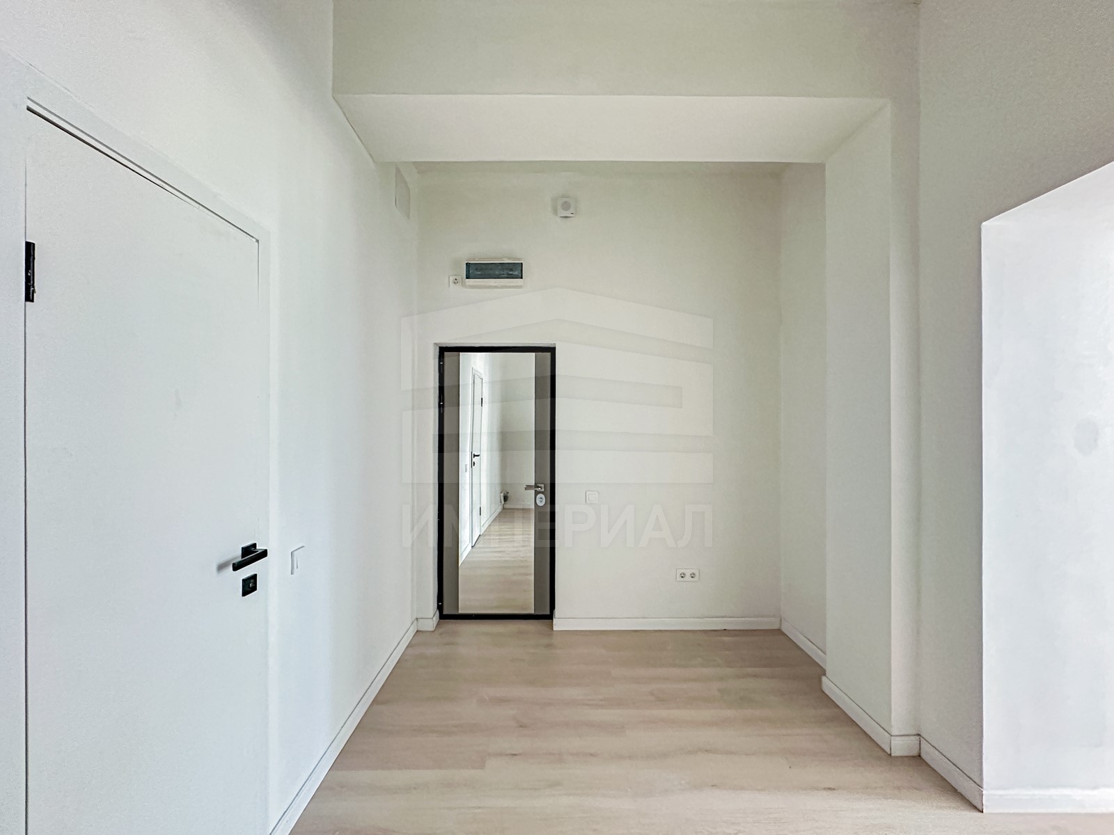 На стенах поклеены обои под покраску, на полу постелен ламинат с плинтусами и откосами. Есть вытяжная вентиляция в санузле и на кухне, выходы хв/гв, место под раковину на кухне. Кроме того, в помещениях уже есть выключатели освещения, розетки для бытовой техники и роутера, а также сделаны закладные для оптоволокна для интернета.
