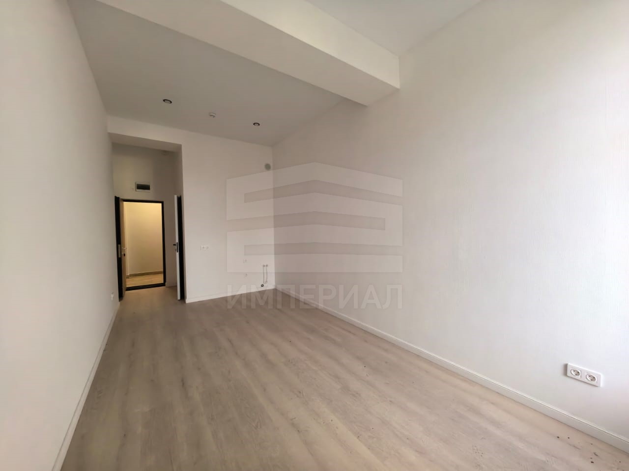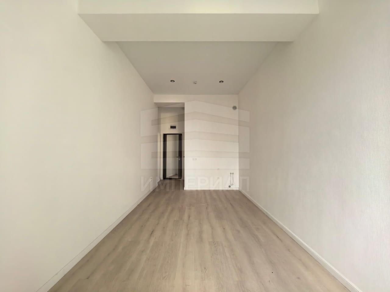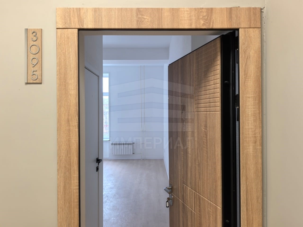На стенах поклеены обои под покраску, на полу постелен ламинат с плинтусами и откосами. Есть вытяжная вентиляция в санузле и на кухне, выходы хв/гв, место под раковину на кухне. Кроме того, в помещениях уже есть выключатели освещения, розетки для бытовой техники и роутера, а также сделаны закладные для оптоволокна для интернета.