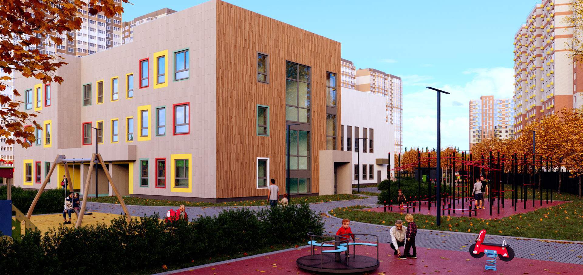 Отдельная многоуровневая парковка. Инфраструктура: детский сад, детские площадки, супермаркет.