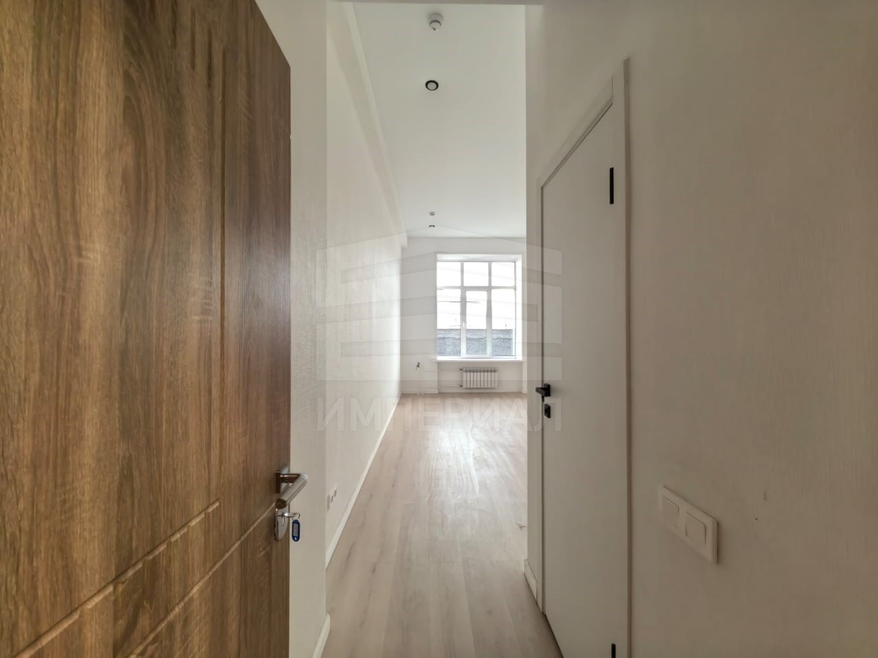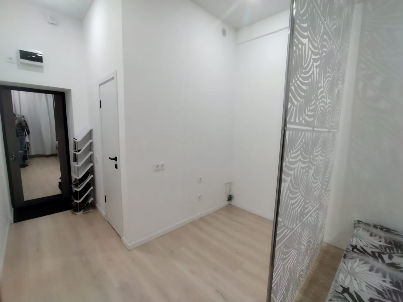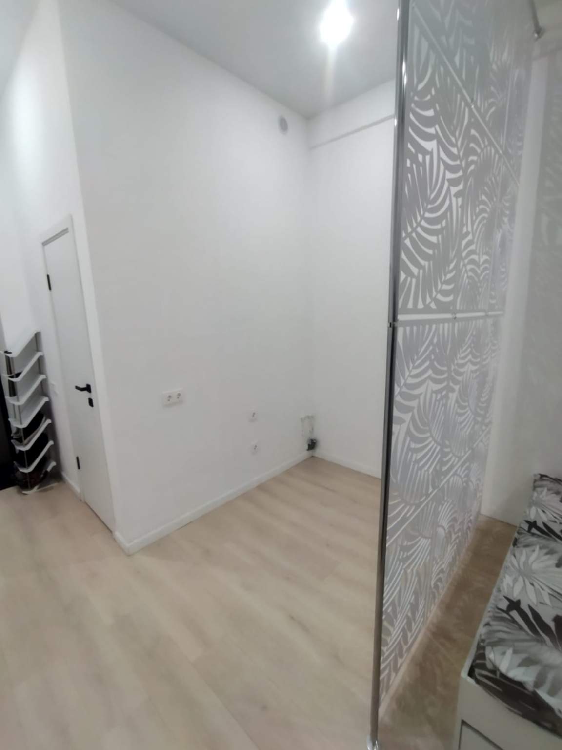 На стенах поклеены обои под покраску, на полу постелен ламинат с плинтусами и откосами. Есть вытяжная вентиляция в санузле и на кухне, выходы хв/гв, место под раковину на кухне. Кроме того, в помещениях уже есть выключатели освещения, розетки для бытовой техники и роутера, а также сделаны закладные для оптоволокна для интернета.