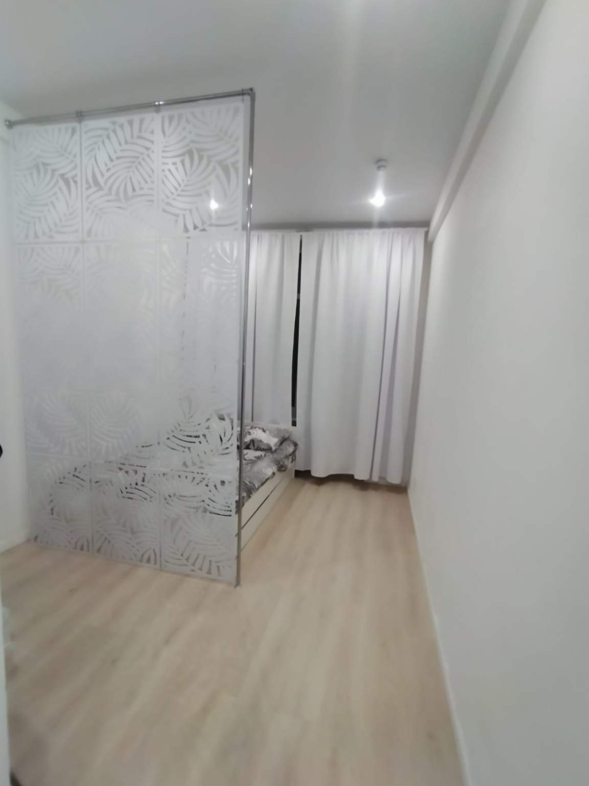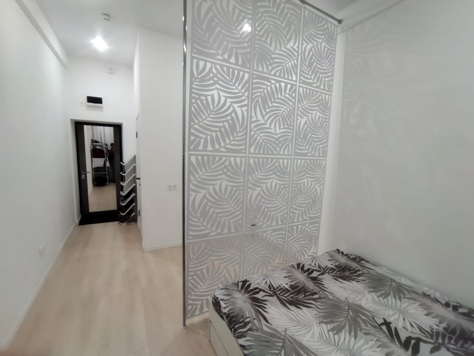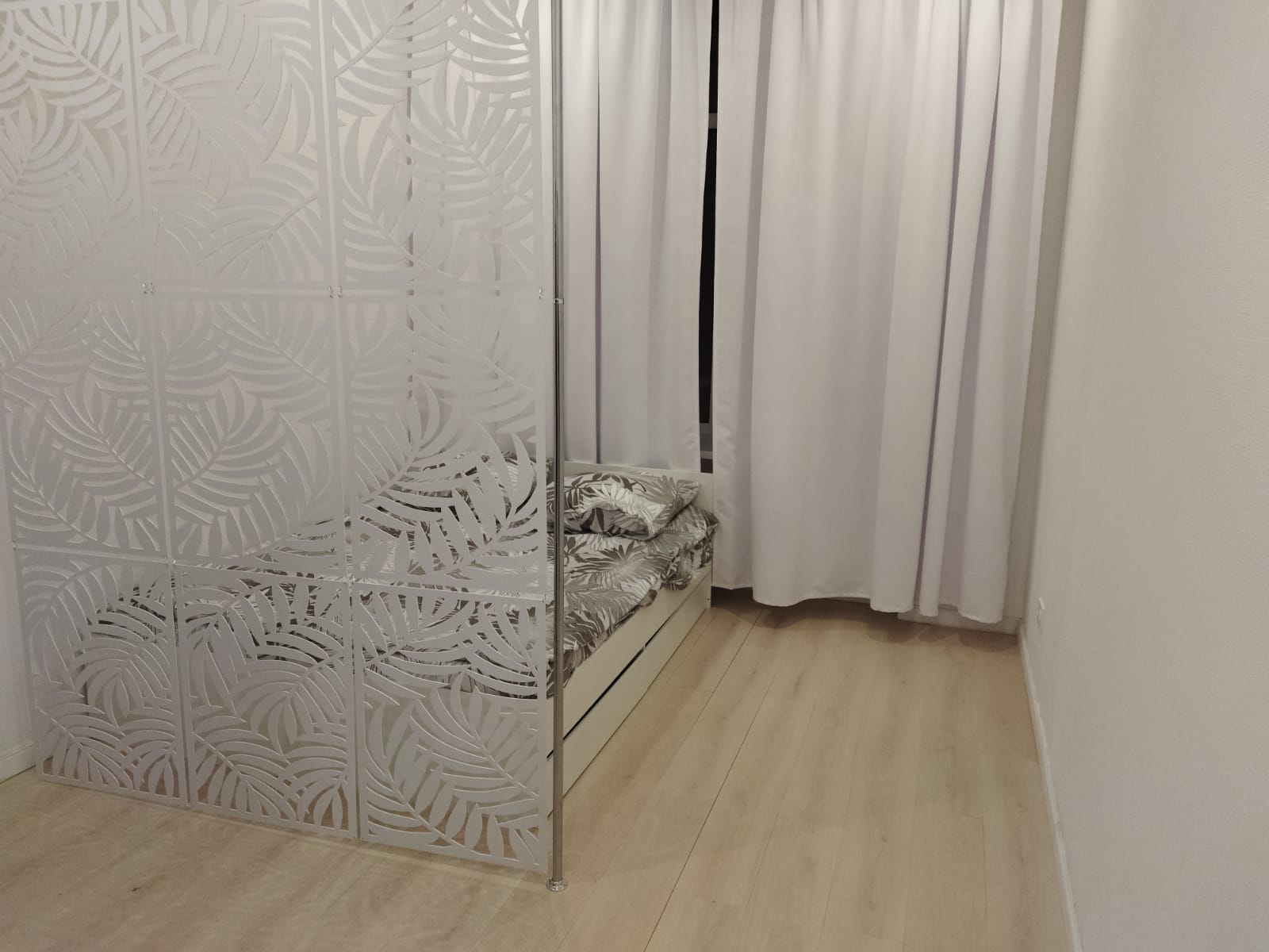 На стенах поклеены обои под покраску, на полу постелен ламинат с плинтусами и откосами. Есть вытяжная вентиляция в санузле и на кухне, выходы хв/гв, место под раковину на кухне. Кроме того, в помещениях уже есть выключатели освещения, розетки для бытовой техники и роутера, а также сделаны закладные для оптоволокна для интернета.