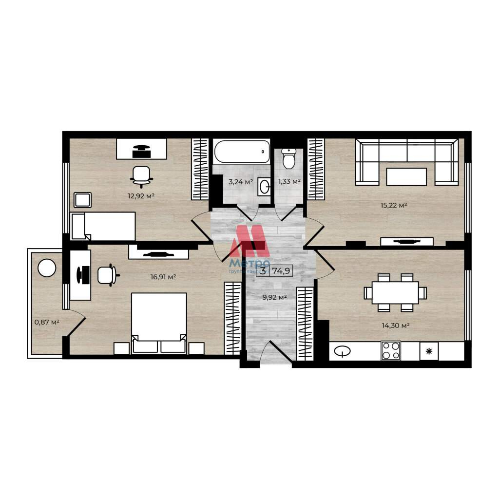 Квартира общей площадью 74,9 м2