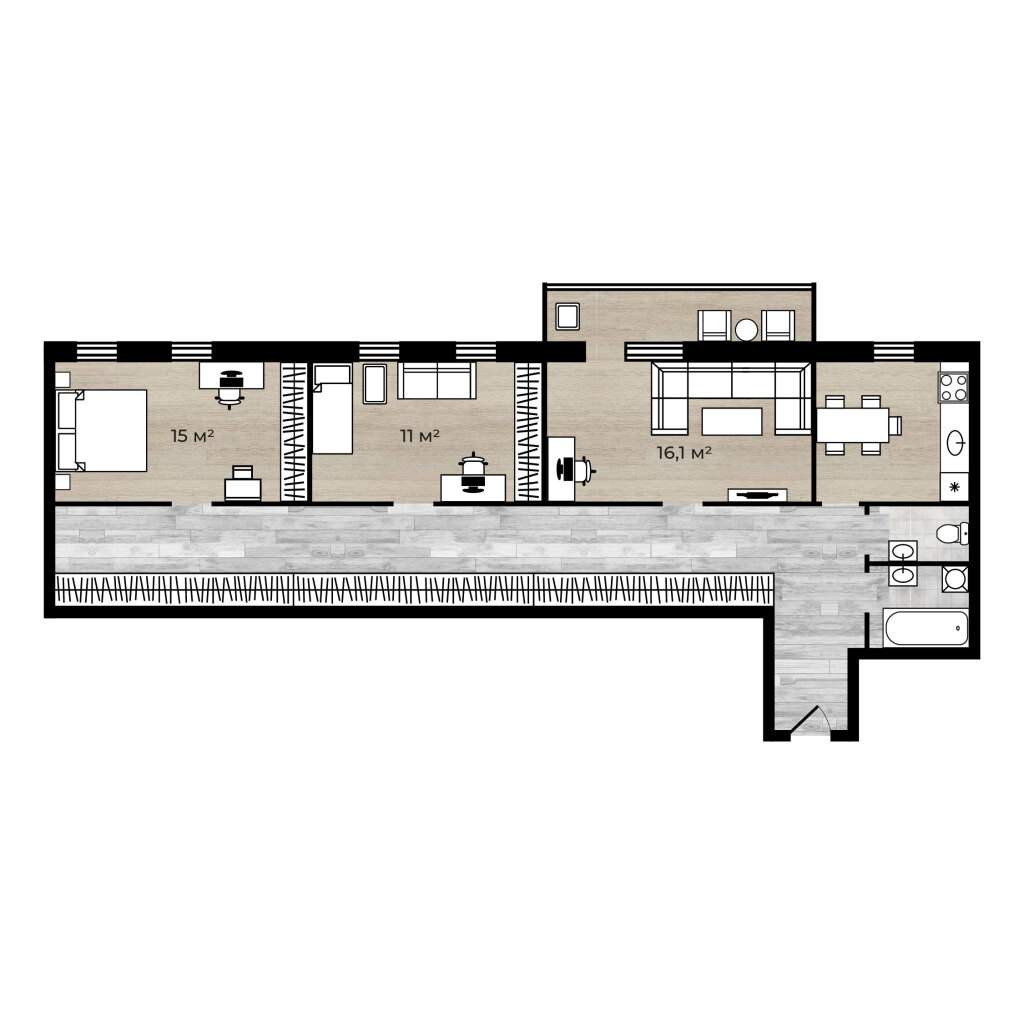 - 3 изолированные комнаты, вместительный коридор и большая кухня ;